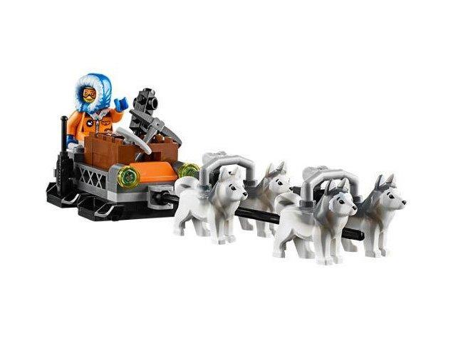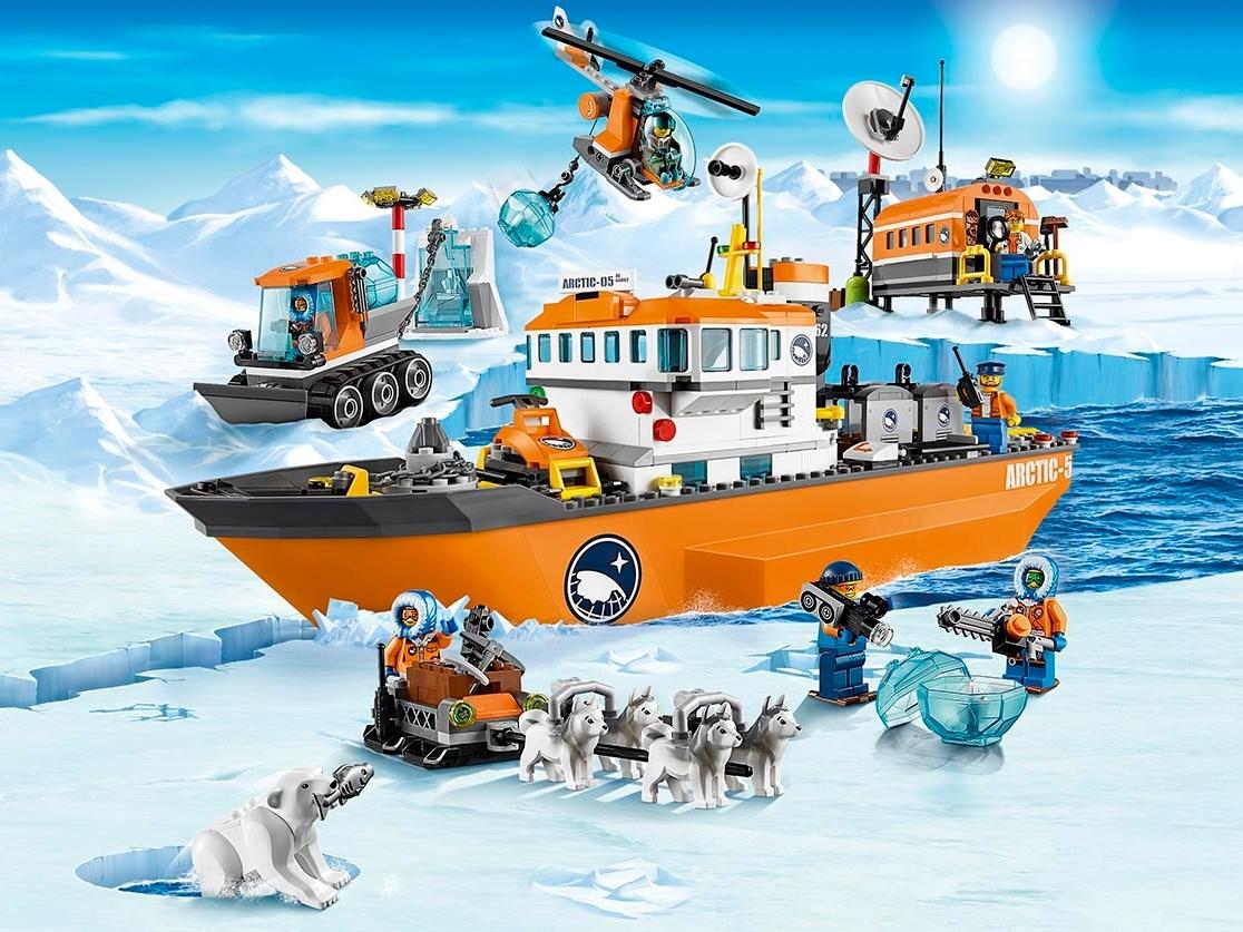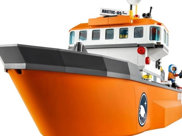 Большой ледокол станет незаменимым помощником для всех исследователей Арктики! Его корпус выполнен из ярких оранжево-белых деталей с добавлением наклеек с названием корабля и логотипов научной организации. В носовой части серой палубы установлен поворотный механизм для управления якорем. Вокруг него видны сигнальные жёлтые огни. Центральное место судна занимает капитанский мостик. Подняв часть крыши, можно заглянуть внутрь и рассмотреть кресло капитана, штурвал и навигационные приборы. В трюме корабля тоже есть два помещения, спрятанные под открывающимися люками палубы. Это прямоугольный моторный отсек и каюта команды с двумя кроватями. Корма ледокола представляет собой грузовую платформу для транспортировки двух металлических контейнеров с инструментами или ледяных глыб с полезными ископаемыми. Также здесь организована взлётно-посадочная площадка для вертолёта. Размер ледокола в собранном виде составляет 18х42х10 см. Также из деталей набора Вы сможете построить снегоход; сани с собачьей упряжкой; вертолёт (6х14х13 см) с вращающимися лопастями и активной лебёдкой; исследовательскую базу (17х13х15 см) с радаром, антенной, микроскопом, холодильником, кроватью и компьютером; и бульдозер (16х5х2 см) с подвижными гусеницами и отвалом для уборки снега.