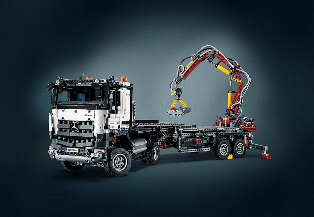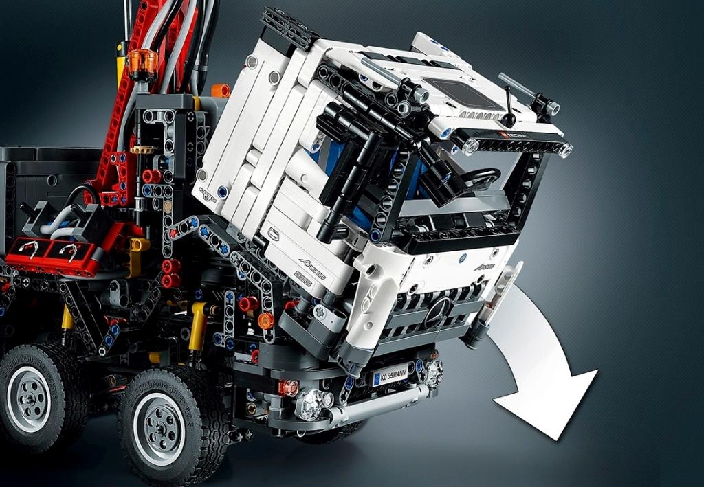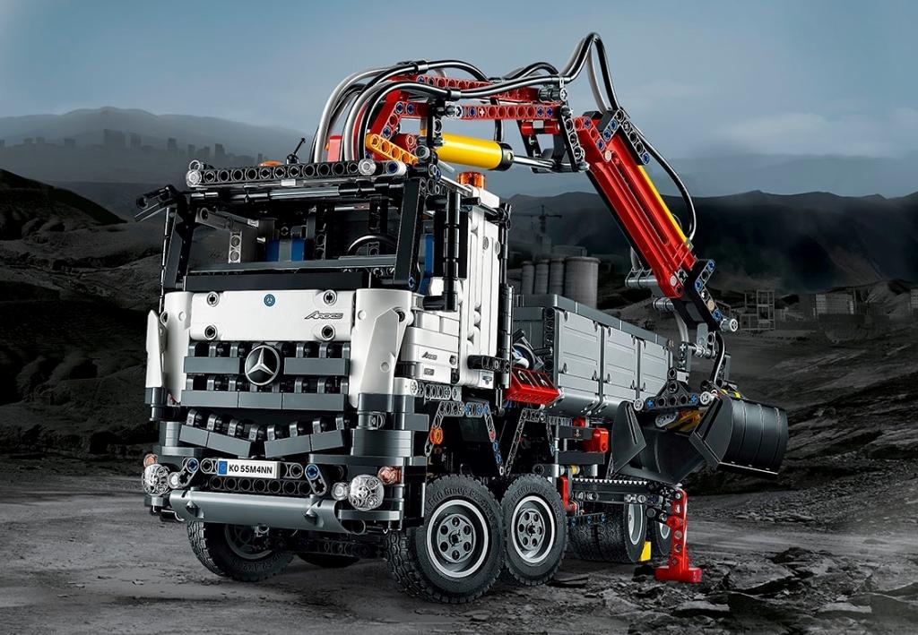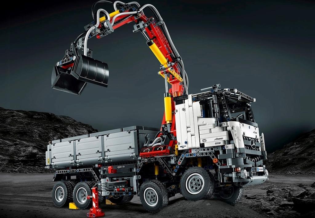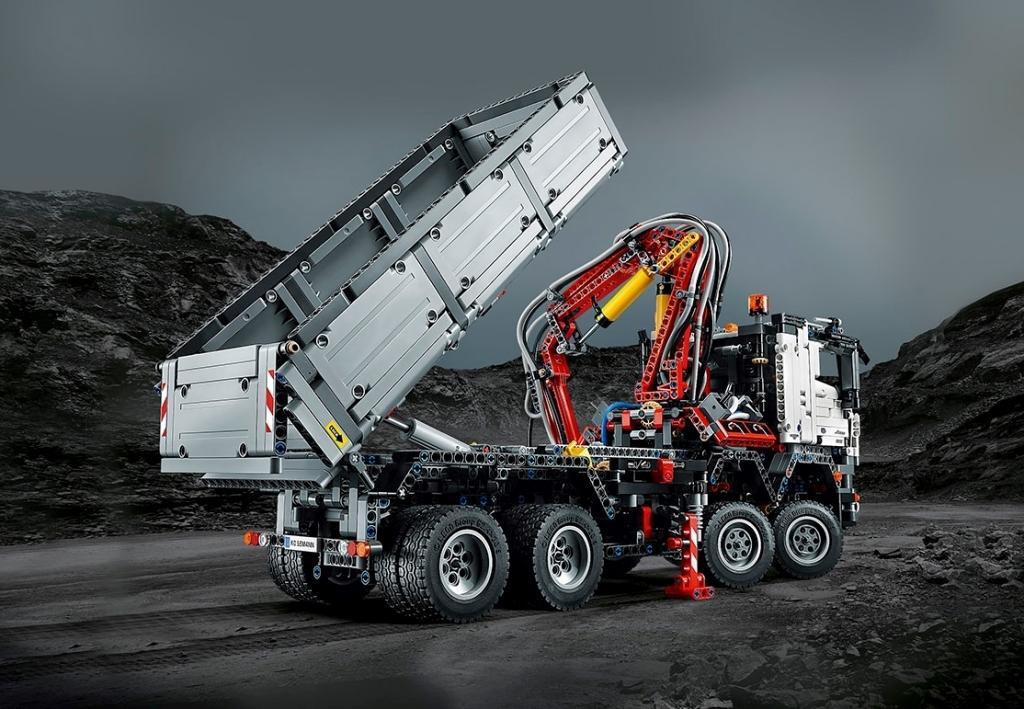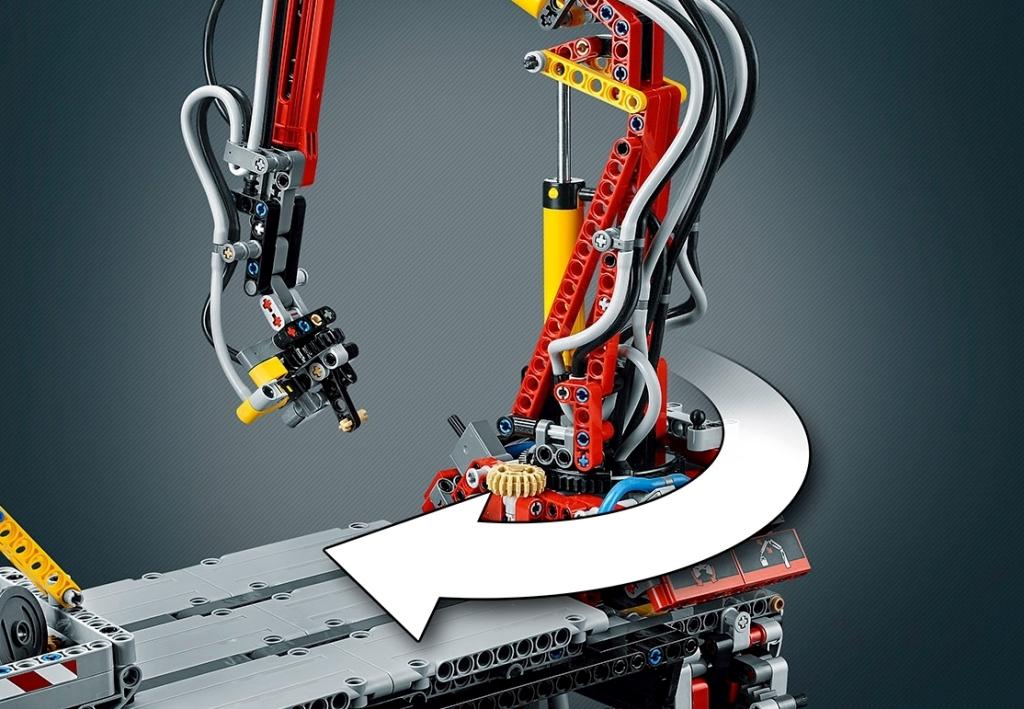 Масштабная копия многофункционального грузовика станет лучшим подарком для поклонников серии! Корпус грузовика выполнен из бело-серо-чёрных деталей с добавлением красных элементов и узнаваемых логотипов. Спереди видна массивная кабина водителя, оборудованная боковыми зеркалами, открывающимися дверями, системой освещения, непробиваемой радиаторной решёткой, двумя синими креслами и приборной панелью. Откинув кабину, можно рассмотреть 6-ти цилиндровый двигатель с жёлтыми подвижными поршнями. Ходовая часть грузовика представлена независимой подвеской с амортизаторами особой прочности. На передней оси установлены четыре рулевых колеса, управлять которыми можно с помощью закреплённых на крыше сигнальных огней. Задняя ось выглядит очень надёжной. Это достигается благодаря спаренным колёсам, повышающим маневренность и грузоподъёмность. Чтобы предотвратить опрокидывание корпуса во время погрузочных работ, необходимо воспользоваться выносными опорами. Выдвигаясь автоматически, они встают поперёк подвески, повышая устойчивость грузовика, стабилизируя его положение на неровном грунте и снижая осевые нагрузки. Главной отличительной особенностью модели является подвижная стрела, способная подниматься, опускаться, поворачиваться и вытягиваться. На конце стрелы закреплён цепкий захват, который можно открывать и закрывать при помощи специального рычага. Завершает набор активных функций вместительный багажник. Во время разгрузки он поднимается максимально высоко и открывает задний бортик, что позволяет быстро и аккуратно высыпать груз в нужное место. Размер грузовой машины в собранном виде составляет 54х15х31 см. При желании её можно переделать в строительный грузовик длиной 77 см. Элементы Power Functions, входящие в комплект: - Батарейный отсек (без батареек) - большой мотор - пневматическая система, состоящая из четырёх модульных цилиндров различной длины и диаметра, насоса и 480 см шлангов.