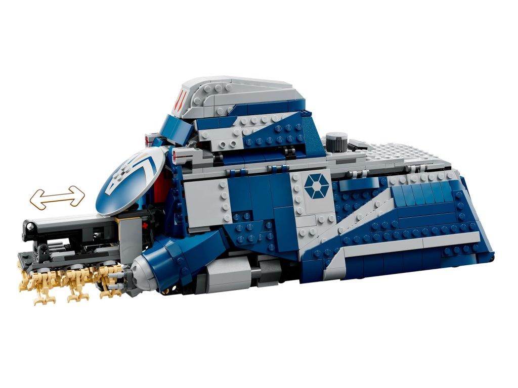 Оживите в памяти динамичные сцены битвы за Фелуцию из «Звездных войн : Войны клонов» с этим конструктором. Это сборное транспортное средство из вселенной «Звездных войн» обладает множеством реалистичных деталей, вдохновляющих на творческие игры, включая стойку для размещения дроидов, которая выдвигается через передний люк при повороте ручки. MTT также имеет откидные боковые панели для легкого доступа к детально проработанному интерьеру, кабину пилота, спидер, спрятанный в заднем отсеке, два шипомета и скрытые колеса для плавного перемещения по ровной поверхности. Используйте этот потрясающий автомобиль в качестве фэнтезийного декора между игровыми приключениями.