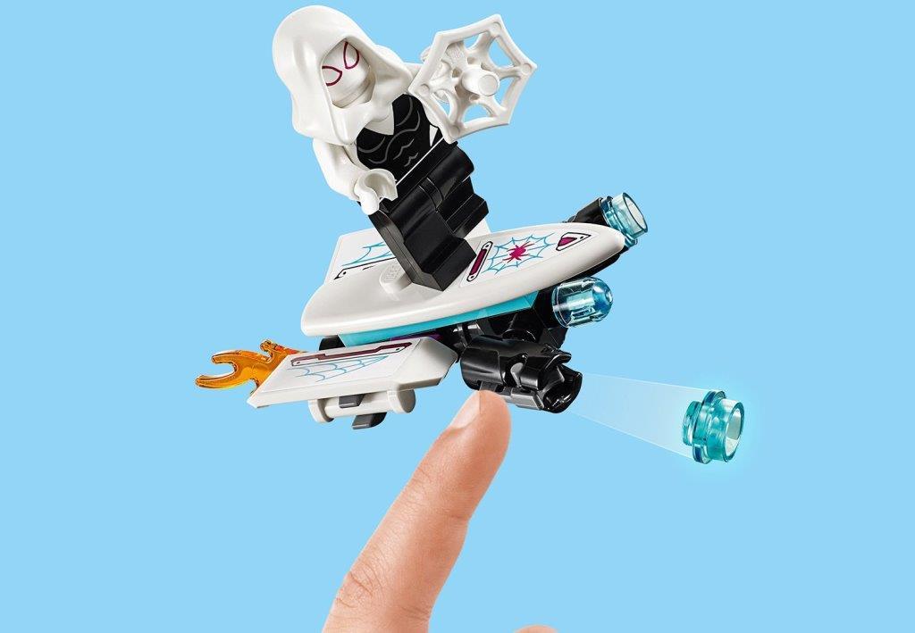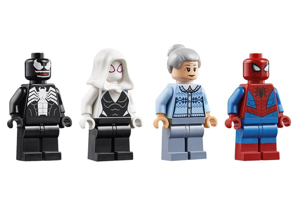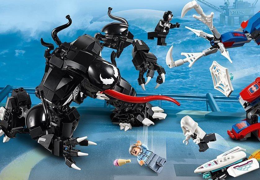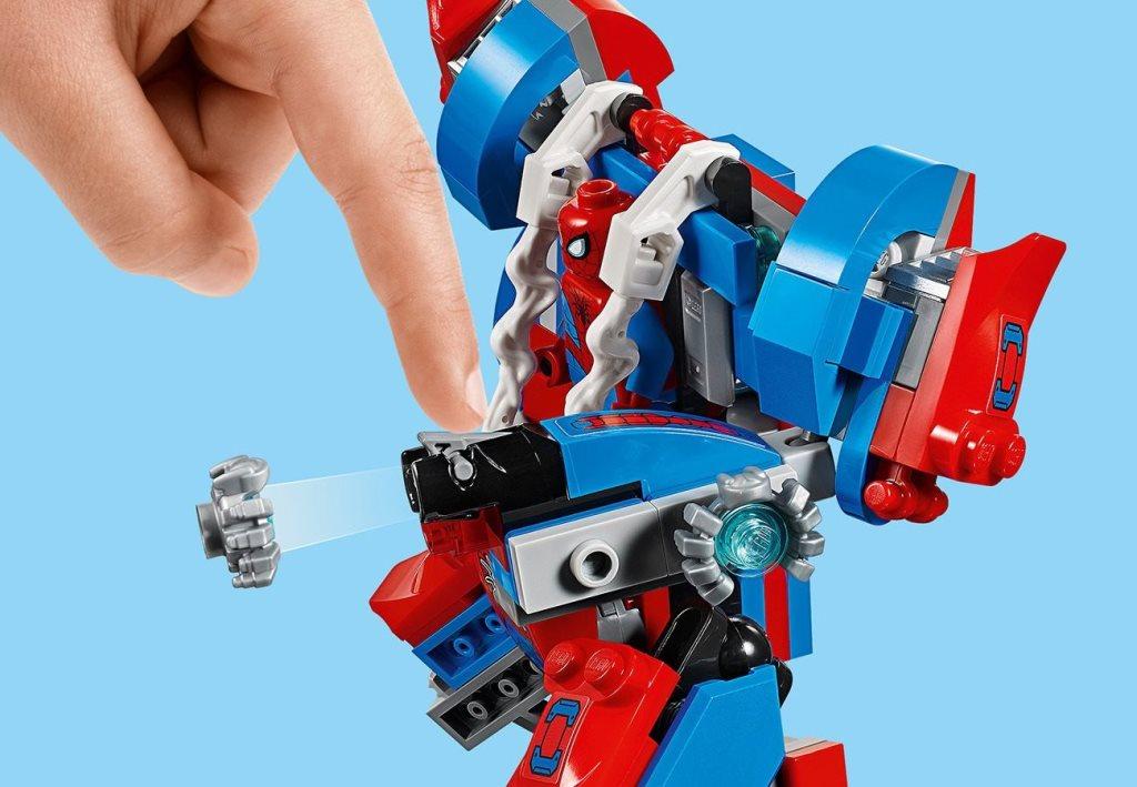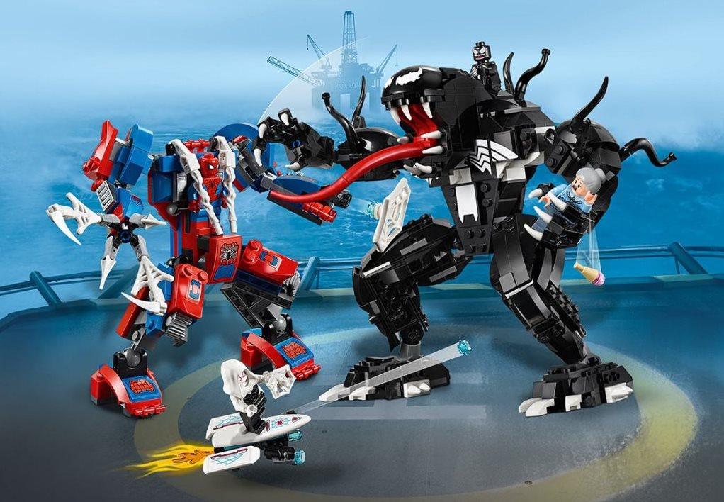 Из деталей конструктора Человек-паук собираются два механических робота для супергероя и симбиота, а также ховерборд Призрачного паука. Красно-синий робот Человека-паука вооружен бластером, которым заканчивается левая рука, а правая рука служит для захвата врага. Шарнирные соединения позволяют роботу принимать различные позы, а широкие ступни делают его устойчивым. Фигурка Человека-паука размещается в специальную кабину, где надежно закрепляется ремнями из сверхпрочной паутины. Бластер робота способен стрелять не только паутиной, но и пулями. Черный механический робот Венома больше и мощнее, чем у Человека-паука. Когтистые руки робота созданы специально для захвата и удержания противника. Огромные ступни обеспечивают ему устойчивость, а шарнирные соединения позволяют воссоздавать эффектные позы для сражений. Черные щупальца на теле машины подвижны, а две из них надежно удерживают Венома в кабине управления на спине робота. Чтобы победить злого симбиота, необходимо объединить силы супергероев: Призрачный паук на своем ховерборде может прикрывать с воздуха механического робота Человека-паука, обстреливая робота Венома. В набор входят 4 минифигурки: Человек-паук, Призрачный паук, Веном, тетушка Мэй. Аксессуары: 3 вида паутины, 6 пуль для оружия, ховерборд Призрачного паука, мороженое, оранжевый разделитель деталей. Размеры роботов Человек-паук против Венома в собранном виде: механический робот Человека-паука - 14х11х4 см; механический робот Венома - 22х18х8 см.