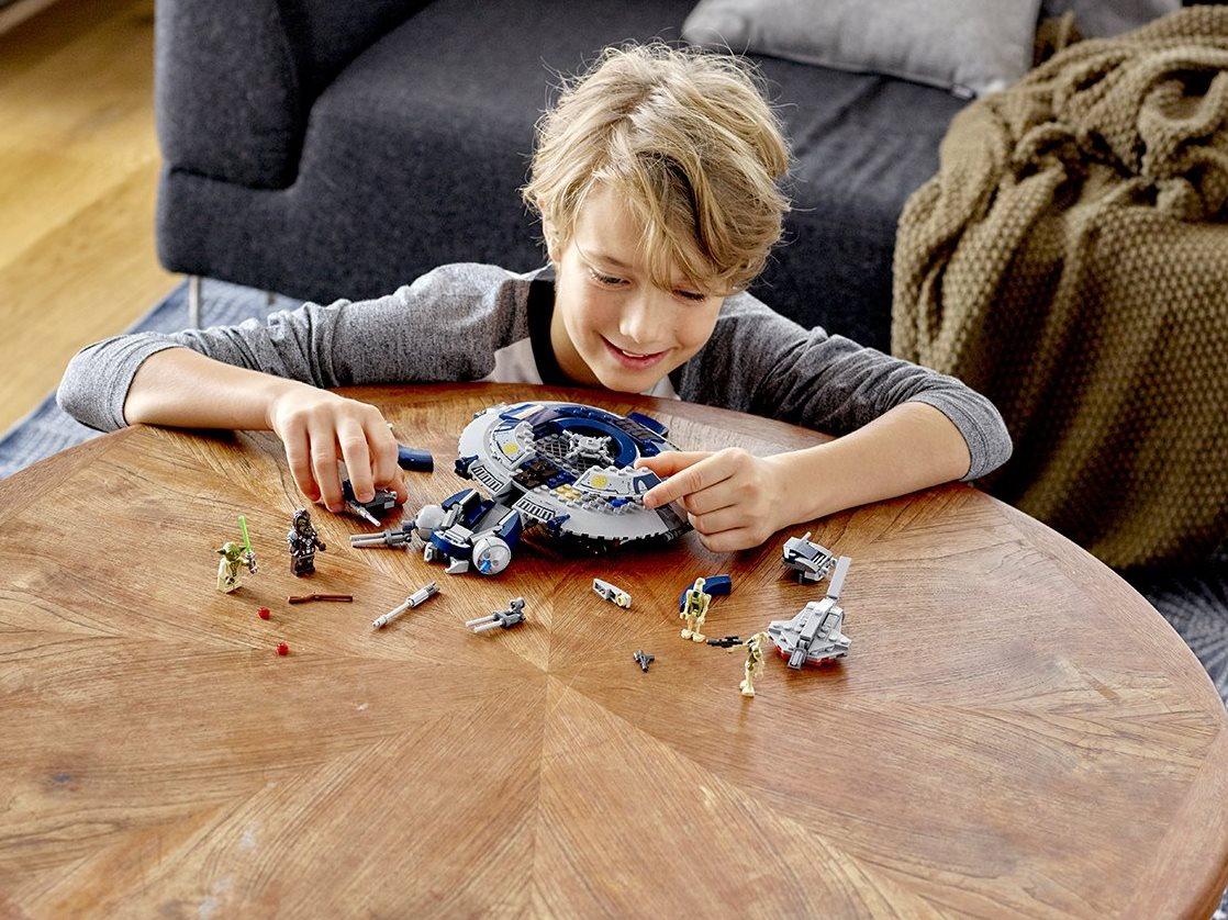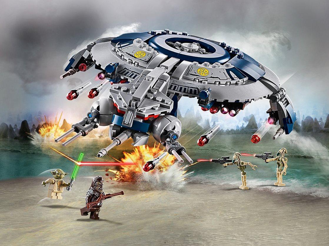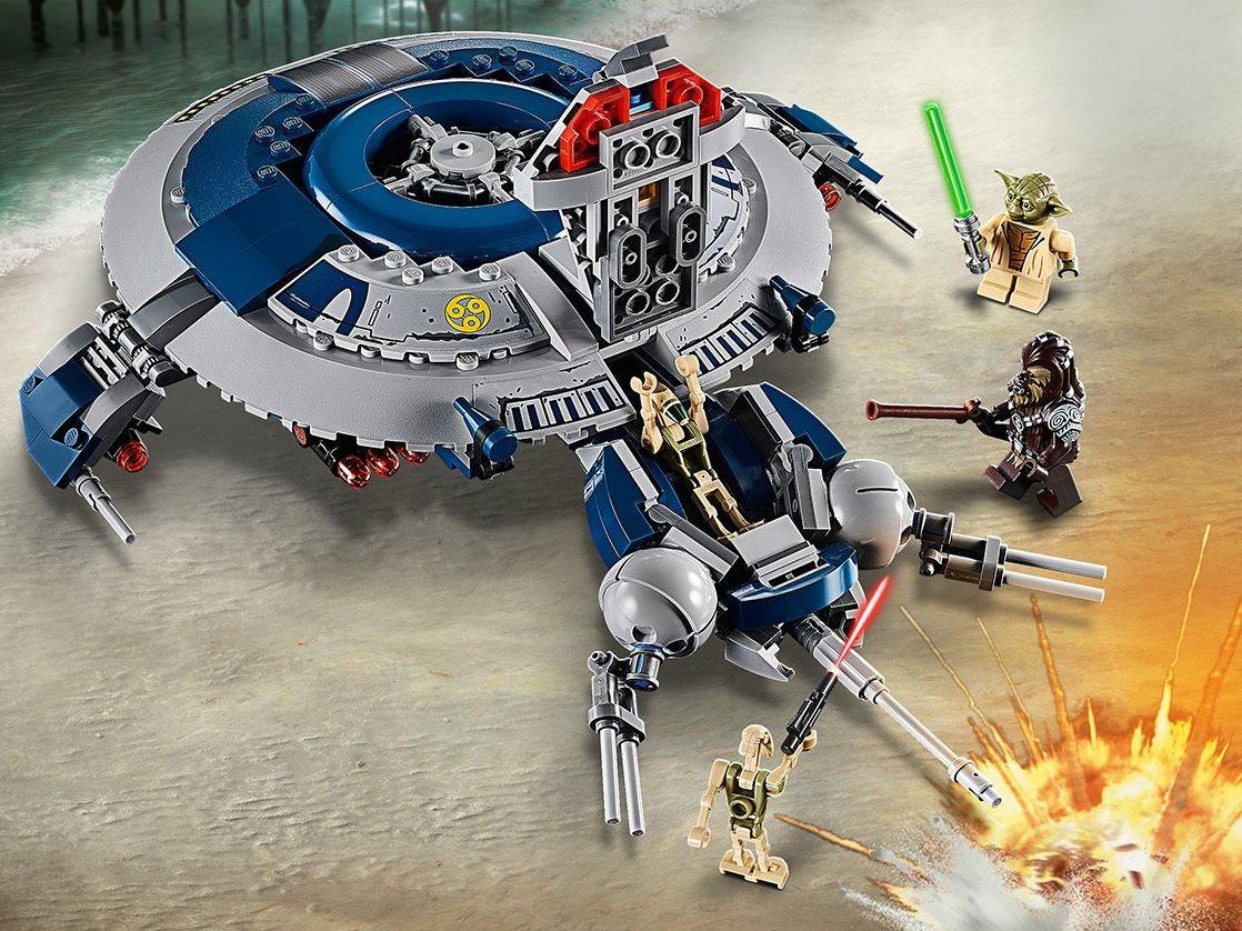 Собери бронированный Дроид-истребитель с лазерными пушками, усади в кабину стрелка и придумай, как вуки Тарффул и магистр Йода смогут обмануть противника и выиграть это сражение с почти неуязвимым звездолетом. Магистр Йода и вуки Тарффул в одном из эпизодов Звездной киносаги были вынуждены вступить в бой с хорошо вооруженным кораблем. Придумай, как им укрыться от огня противника и захватить мощный истребитель. Ведь дроиды не знают усталости — они без перерыва стреляют из пулеметов и выпукают ракеты. Судьба магистра джедаев сейчас в твоих руках, как и Дроид-истребитель с бронированным корпусом и мощными лазерными пушками. Помоги своим героям обмануть стрелков и победить их, проникнув на звездолет. Йода должен выжить, ведь от этого зависит, сможет ли он передать свои знания новым ученикам. Придумывай новые сюжеты и сражайся с врагами! Дроид-истребитель из набора выполнен в серой и темно-синей цветовой гамме, имеет круглую форму. Спереди — открывающаяся кабина пилота, внутри которой ты сможешь разместить фигурку стрелка. Сверху принтованные отсеки. Для удобного приземления истребитель оснащен опускающимися шасси. Оборудован двумя шуттерными пушками и четырьмя сдвоенными ракетными установками. Всё оружие подвижно, может менять угол наклона — это позволяет атаковать врагов с разных позиций В конструкторе четыре минифигурки: вуки Тарфулла, магистра Йоды и два стрелка-дроида с Кашиика, вооруженных бластерами. Размеры Дроида-Истребителя: 5×29×24 см.