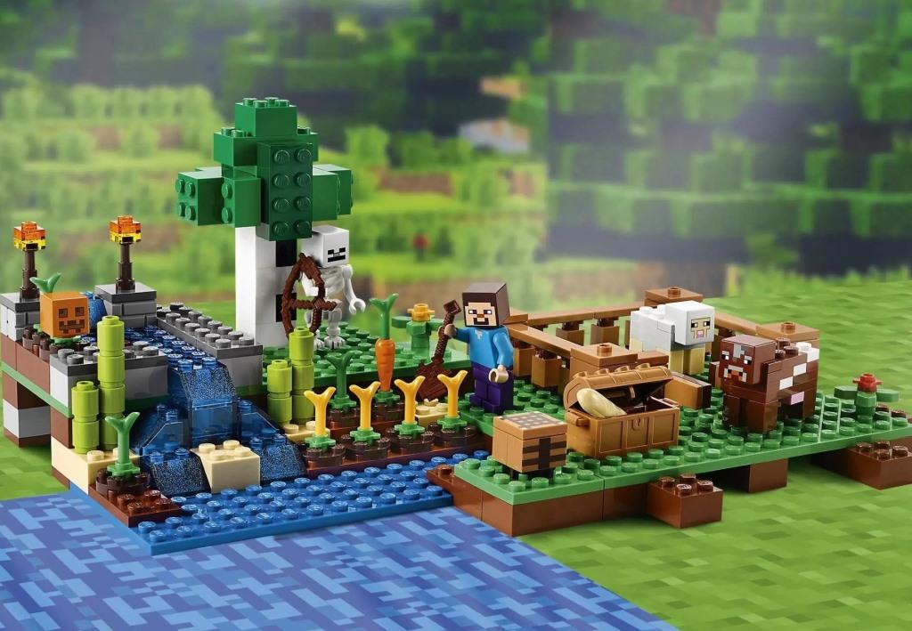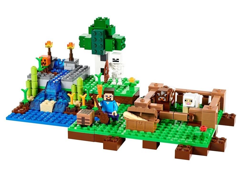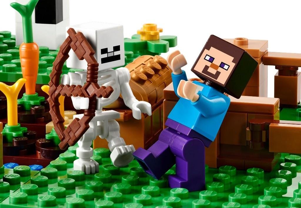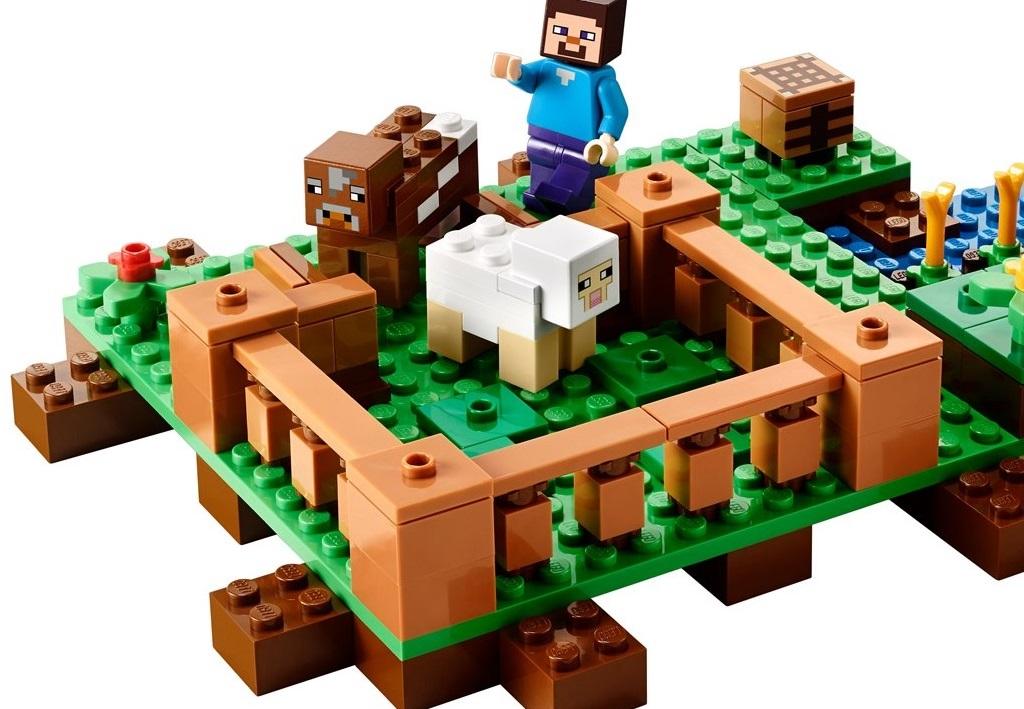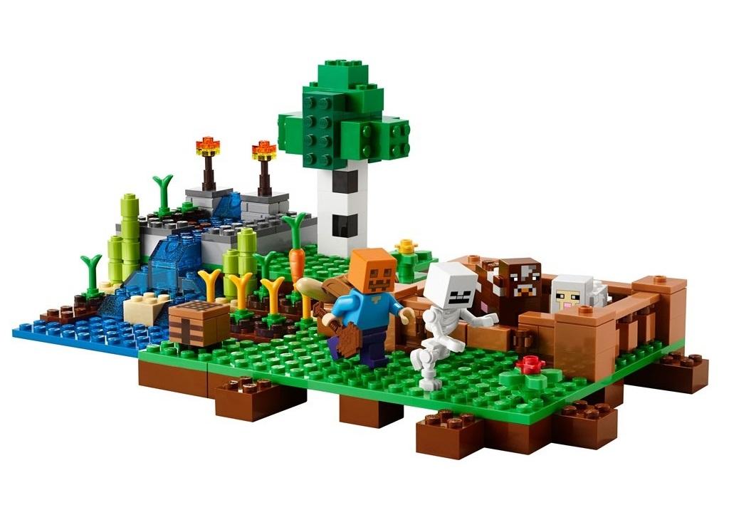 Из деталей набора Вы сможете построить реалистичную ферму, разделённую на две зоны. Слева располагается загон для скота, окружённый деревянным забором. В нём могут поместиться несколько видов домашних животных, например, корова и овца. Справа находятся многочисленные грядки для выращивания пшеницы, сахарного тростника, моркови и тыкв. Благодаря близкому соседству с водопадом и прудом полив овощей будет производиться легко и быстро. Собрав богатый урожай, главный герой игры Стив занимается изготовлением полезных предметов и продуктов питания. Пшеницу он перерабатывает для приготовления белого хлеба или корма для животных. Из тростника он изготавливает бумагу, сахар и зелье. Большая часть урожая моркови идёт на пропитание. Из нескольких оставшихся морковок Стив мастерит удочки для управления осёдланной свиньёй. Тыквы являются самым многофункциональным продуктом. Их необходимо разделать и вырезать на них страшные рожицы. Получившиеся «Светильники Джека» будут иметь максимальный уровень освещения и прослужат намного дольше, чем факелы. Также верхнюю часть тыквы Стив может использовать в качестве шлема. В набор входят 2 фигурки животных: корова и овца, а также 2 минифигурки: Стив с лопатой и скелет с луком и стрелами.