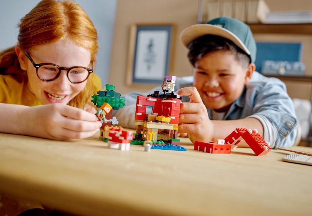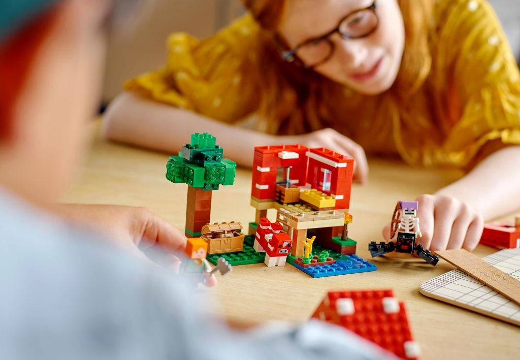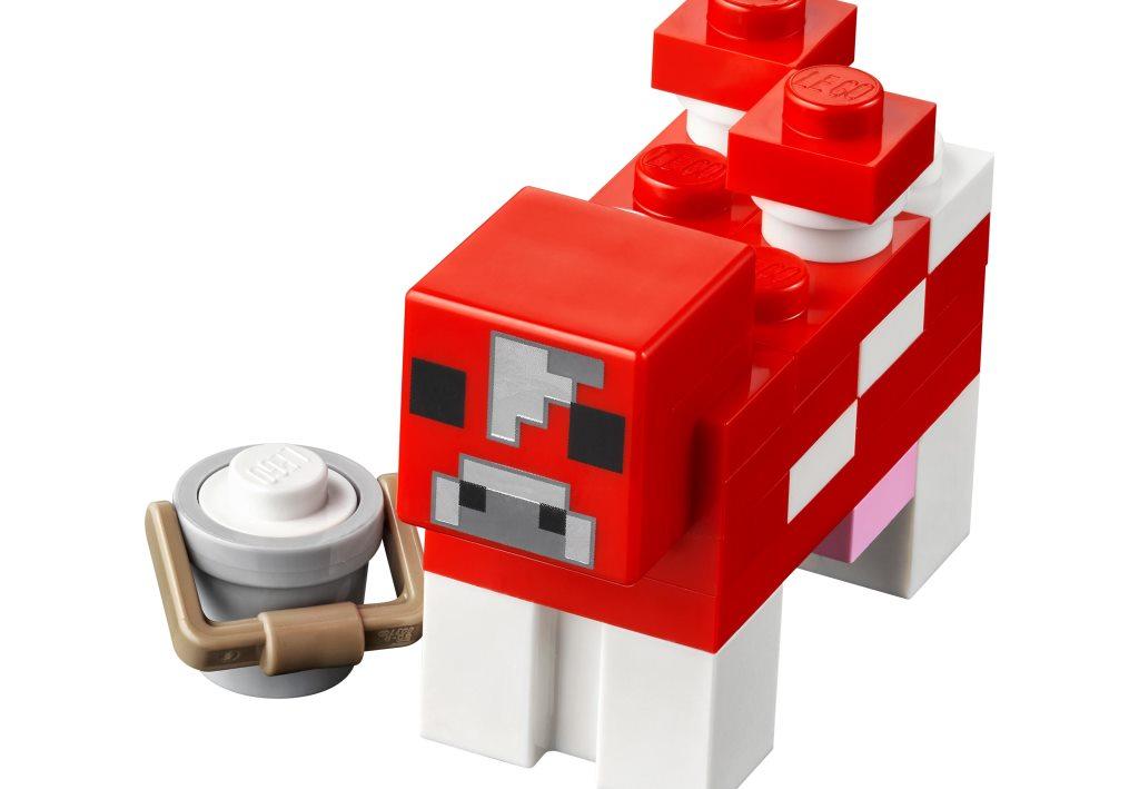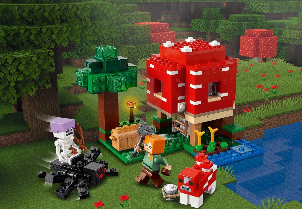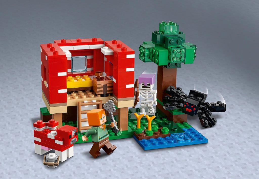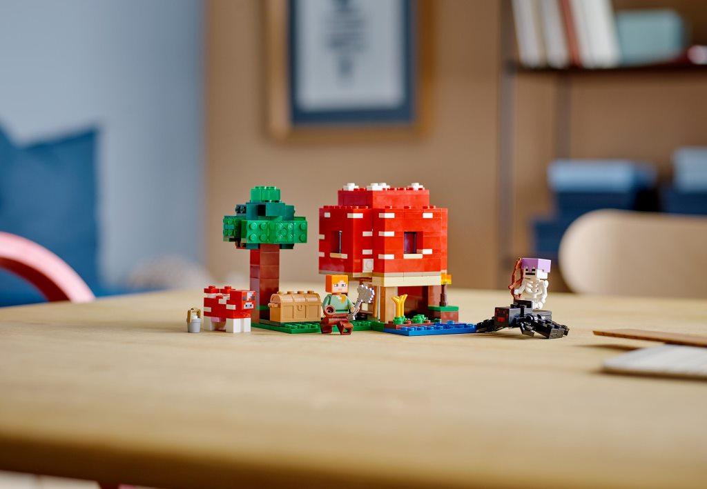 С набором Грибной дом дети и взрослые смогут построить необычный дом на зеленой лужайке и познакомиться поближе с обитателями мира Майнкрафт. С набором можно разыграть множество интересных сцен и сюжетов, выращивать растения, доить корову и отгонять от своих угодий злого Скелета с пауком. Увлекательный набор посвящён одноименной и знаменитой на весь мир игре Майнкрафт. Комплект состоит из 272 деталей, минифигурок Алекс и Скелета. Из всех элементов конструктора, с помощью печатной инструкции собирается игровая площадка 10 см в высоту, 13 см в ширину и 15 см глубину. Основным сооружением набора является жилая постройка в виде красного гриба. Чтобы попасть внутрь дома, необходимо воспользоваться лестницей, а чтобы обеспечить себе легкий доступ к жилью, можно легко снять одну из стен дома. Внутри комнаты установлена желтая кровать и верстак. На лужайке возле грибного дома расположился небольшой огород с несколькими ростками растений, ручей и высокое дерево с сундуком. Для комфортной жизни у Алекс есть не только уютное жилье и огород, но и необычная корова красного цвета, которая дает особенное и очень вкусное молоко, для этого в наборе предусмотрено небольшое ведро. Но будьте осторожны, на Алекс в любой момент может напасть злобный Скелет, оседлавший большого черного паука, а также у него есть лук, из которого он сможет выстрелить даже издалека.