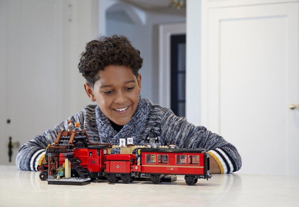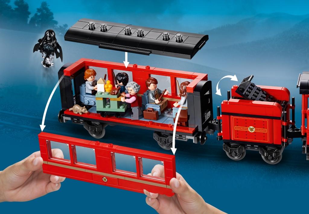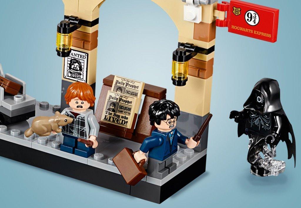 Купи Хогвартс-экспресс с платформой, минифигурками героев и аксессуарами. Проведи Гарри, Гермиону и Рона через платформу 9¾ и размести их в вагоне. Воспроизведи их первую встречу с дементором и знакомство с Римусом Люпином. Построй свой Лего Хогвартс-экспресс и вспомни, какие приключения ожидали Гарри Поттера перед третьим годом обучения, еще по дороге в Хогвартс. Встреча с дементором, преследующим Сириуса Блэка, который сбежал из Азкабана, произвела на Гарри, Рона и Гермиону очень сильное впечатление. Хорошо, что с ними в купе ехал Римус Люпин, который прогнал страшного дементора. Набор состоит из 801 деталей, из которых ты можешь построить часть вокзала с переходом к другим железнодорожным путям. Между платформами 9 и 10 открывается проход к платформе 9¾,через который может свободно пройти Рон с тележкой, везущий свои чемоданы и крысу Коросту. Здесь его уже ждут Гарри и Гермиона, которые рассматривают объявление о побеге узника из Азкабана. В поезде сразу за паровозом расположен багажный отсек, куда можно сложить чемоданы. За ним прицеплен вагон, у которого снимаются крыша и боковая стенка. Римус Люпин располагается в купе, не расставаясь со своей волшебной палочкой. В вагоне можно встретить разносчицу сладостей с тележкой, у которой можно купить всё что угодно, и даже шоколадную лягушку. Размеры платформы: Д×Ш×В — 17×31×13 см. Размеры поезда: Д×Ш×В — 46×5×9 см. В наборе ты найдешь шесть минифигурок: Гарри Поттера, Рона Уизли, Гермионы Грейнджер, Римуса Люпина со своими волшебными палочками, разносчицы сладостей и дементора. Аксессуары: тележка для багажа, три чемодана, тележка для сладостей, мороженое, шоколадная лягушка, две газеты, объявление.