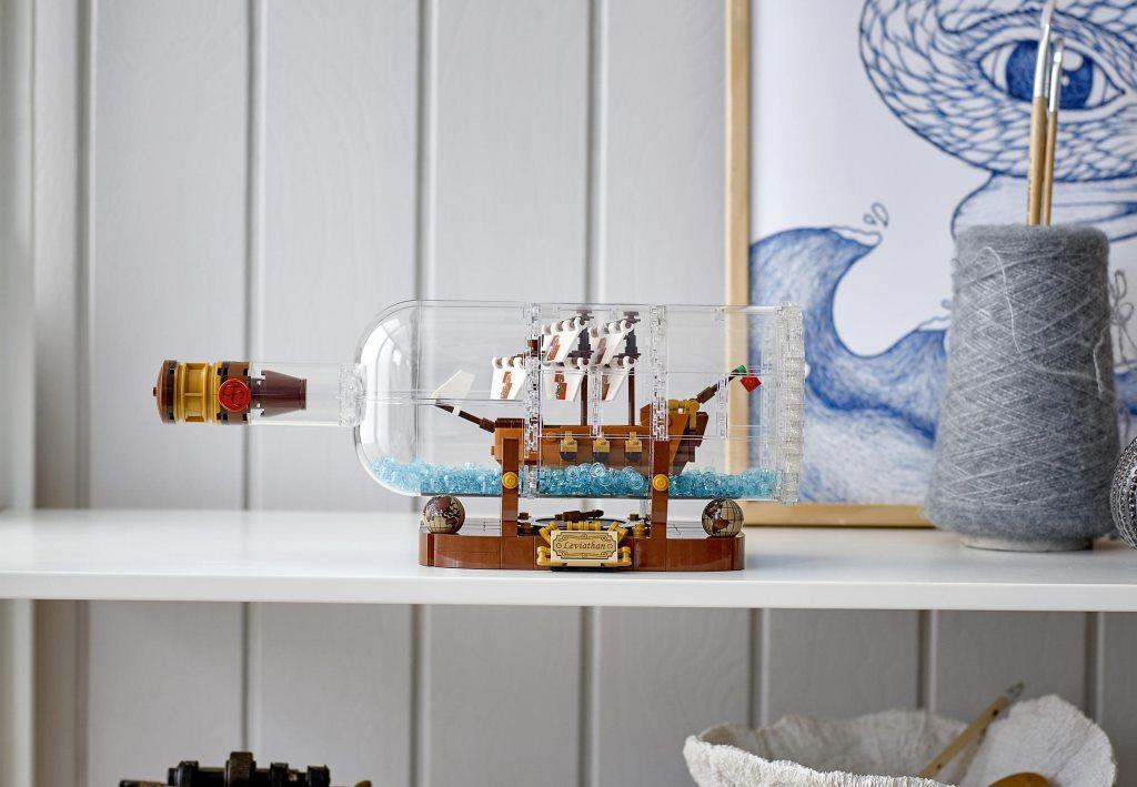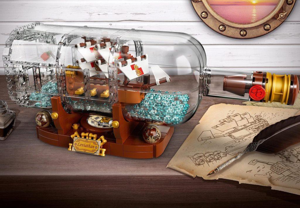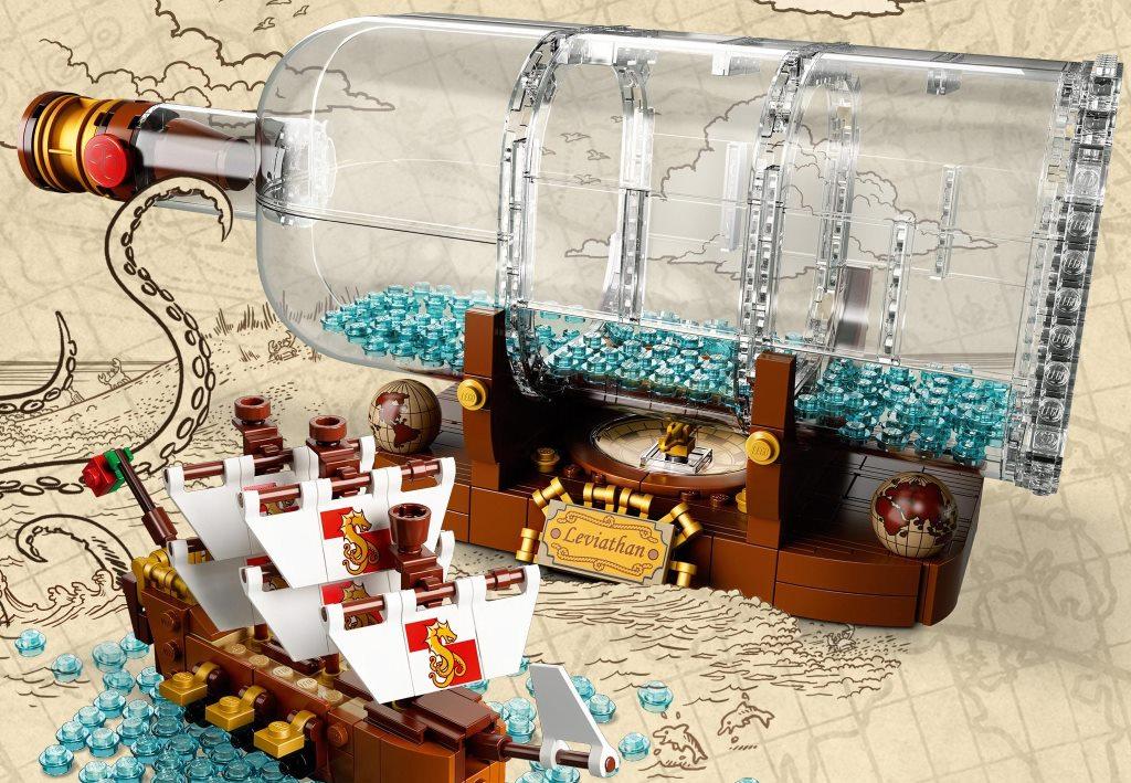 Модель из набора состоит из трёх основных частей: - корабль (8х14х5 см) с тремя мачтами, декорированными парусами, шестью пушками, капитанским мостиком, «вороньим гнездом» и позолоченными деталями - прозрачная бутылка с пробкой, эксклюзивной «восковой» печатью и наполнением в виде 280 голубых элементов, символизирующих морские волны - дисплей, украшенный двумя старинными глобусами, компасом с вращающейся стрелкой и табличкой с названием корабля «Левиафан» Размер бутылки вместе с дисплеем составляет 10х31х10 см.