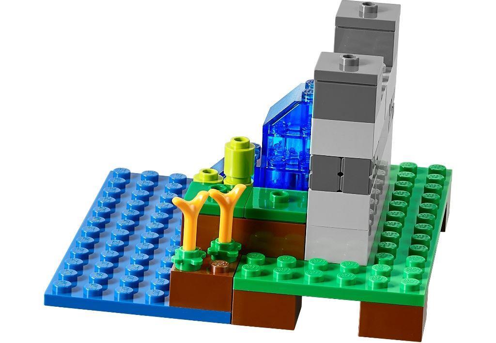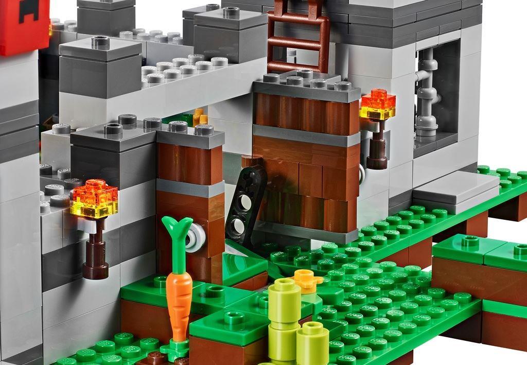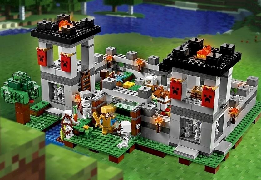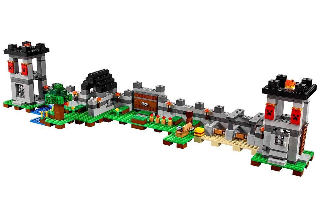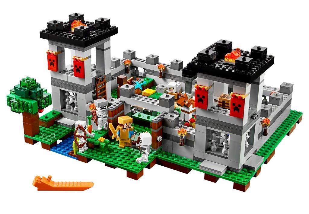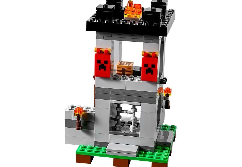 Крепость из набора представляет собой прямоугольное каменное укрепление с башенками и дозорными вышками. На гладких серых стенах предусмотрены подставки для факелов, отпугивающих непрошеных гостей. Единственный вход, ведущий во внутренний двор, оборудован надёжными деревянными воротами. Они имеют тайный механизм, при нажатии на который дверцы синхронно распахиваются. Рядом с воротами устроен небольшой огород. Благодаря наличию водоёма, урожай созревает очень быстро, что позволяет жить в крепости без особых хлопот. Здесь прекрасно растёт морковь, пшеница и сахарный тростник, а также наливаются соком сладкие яблоки. Как внутри, так и снаружи крепости благоухают цветы, среди которых особо выделяются ярко-жёлтые одуванчики и красные маки, посаженые в цветочные горшки. Для охраны крепости и защиты её от набегов вооружённых скелетов применяется настоящий боевой арсенал. За подступами к воротам можно следить из дозорных башен, построенных в торцах окружной стены. Обе башни абсолютно симметричны. Они состоят из двух этажей, каждый из которых имеет прочное квадратное основание. Внизу располагаются тюремные камеры с изогнутыми решётками и массивными дверями. Чтобы их открыть, необходимо нажать на рычаг, закреплённый на стене. Над темницами открыты просторные площадки, украшенные оранжевыми флагами с изображениями головы Крипера. Они могут служить наблюдательными пунктами или хранилищами для особо важных трофеев. На вершине башен видна чёрная гладкая кладка с кубическими выступами. Это угольные блоки, позволяющие разводить огонь и освещать территорию крепости на протяжении всей ночи. Если коварные скелеты всё-таки не испугаются зажженных факелов и попытаются атаковать обитателей крепости, то следует пустить в ход потайное оружие. В одну из боковых стен встроены два мощных шутера, бьющих точно в цель. Но если и их убойной силы будет недостаточно, то нужно облачиться в доспехи и пойти в рукопашный бой.