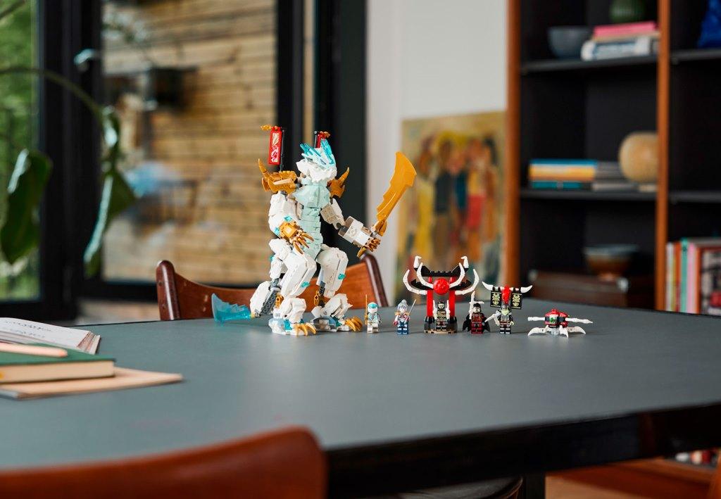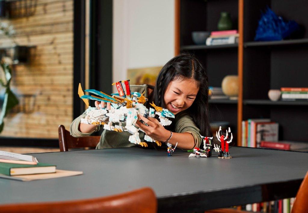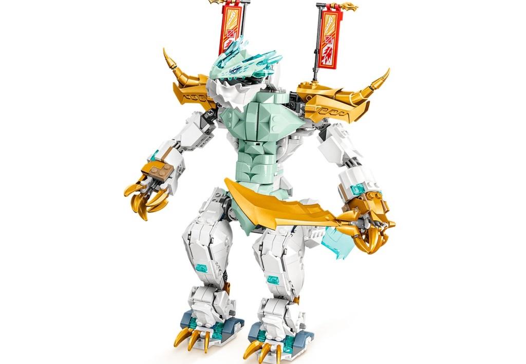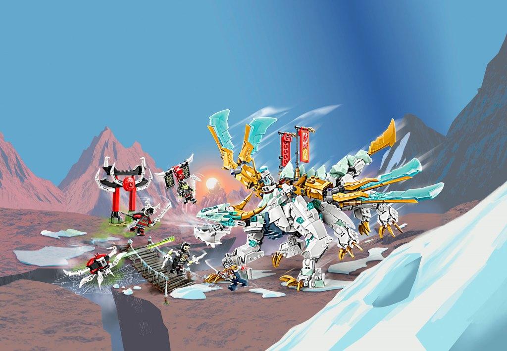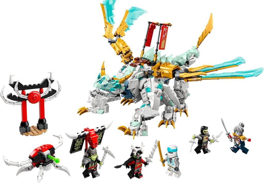 В наборе «Ледяной дракон Зейна» есть все, что нужно детям в возрасте от 10 лет, чтобы насладиться ролевой игрой со своими героями-ниндзя. Эту модель NINJAGO 2-в-1 можно превратить в подвижного ледяного дракона с 6 ногами, длинным хвостом, рогами и крыльями с золотыми лезвиями, а затем перестроить в подвижного воина-дракона, стоящего на 2 ногах и держащего большой золотой клинок. Игрушечный ледяной дракона 2-в-1 — дети будут в восторге, играя в ниндзя с этим набором. -5 минифигурок — Зейн и Пиксал с оружием, чтобы сражаться с Костяным рыцарем, Костяным воином и Костяным королем, у которых есть собственное оружие из арсенала вооружения зеленых костяных воинов, а также их собственный храм. -Собирайте и перестраивайте — дети могут собрать подвижного ледяного дракона с 6 ногами, длинным хвостом, рогами и крыльями с золотыми лезвиями, а затем превратить его в подвижного воина-дракона на 2 ногах с золотым клинком. Играйте и собирайте — этот игровой набор с ниндзя из 973 деталей можно подарить детям в возрасте от 10 лет и старше в качестве подарка на день рождения. Он предлагает увлекательную сборку перед тем, как они разыграют истории о ниндзя. Большая модель -игрушку в виде фигурки ледяного дракона размером более 19 см в высоту, 46 см в ширину и 46 см в глубину можно демонстрировать в детских спальнях между играми.