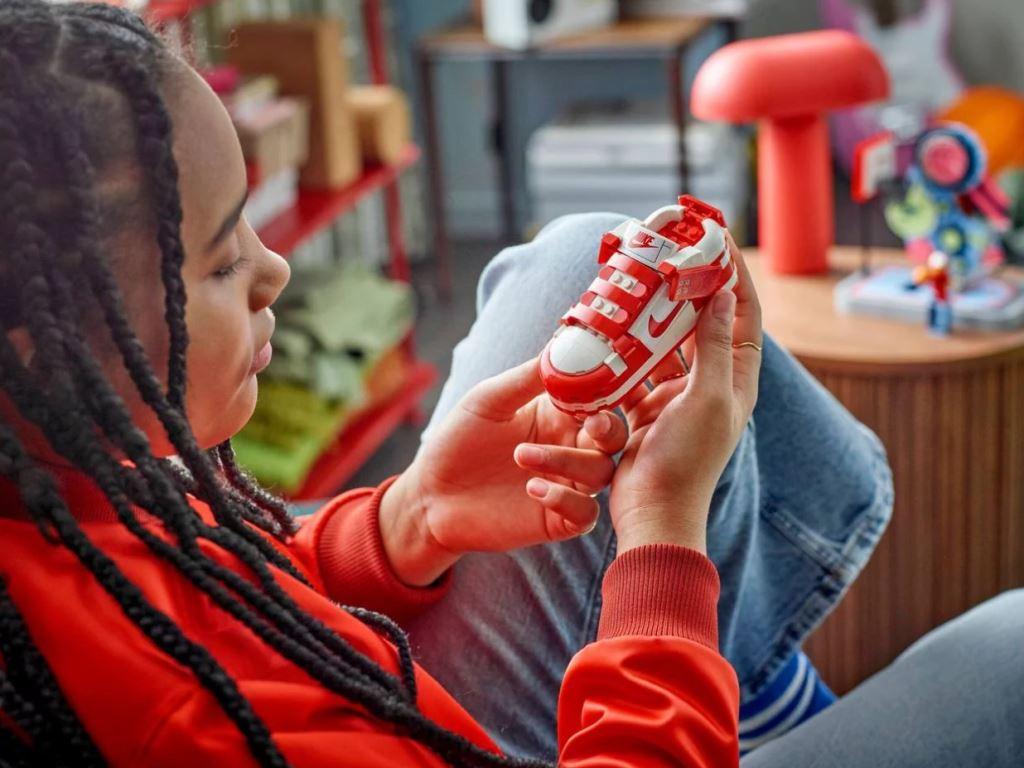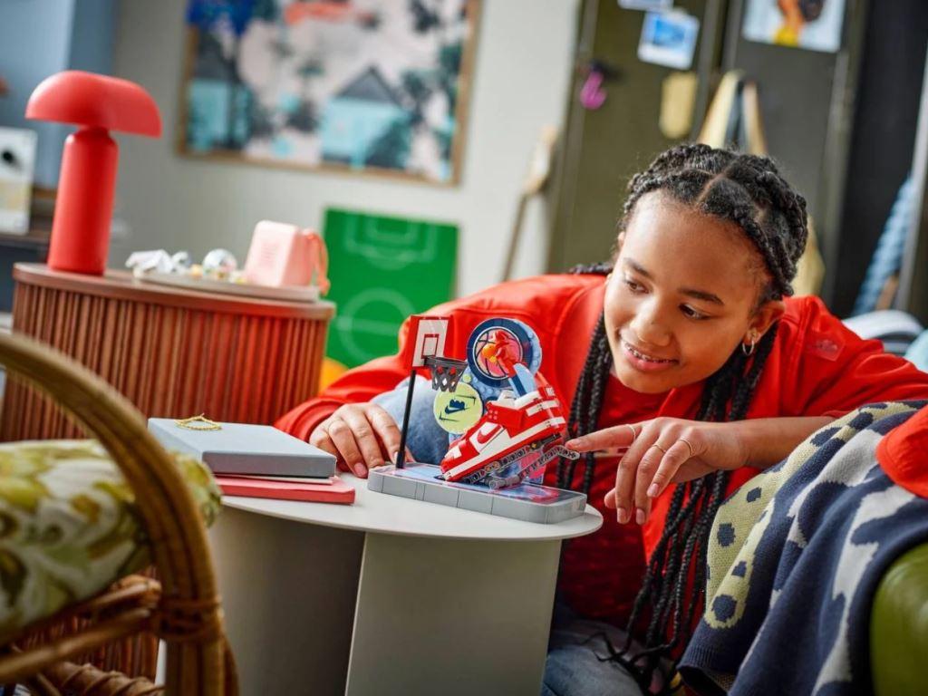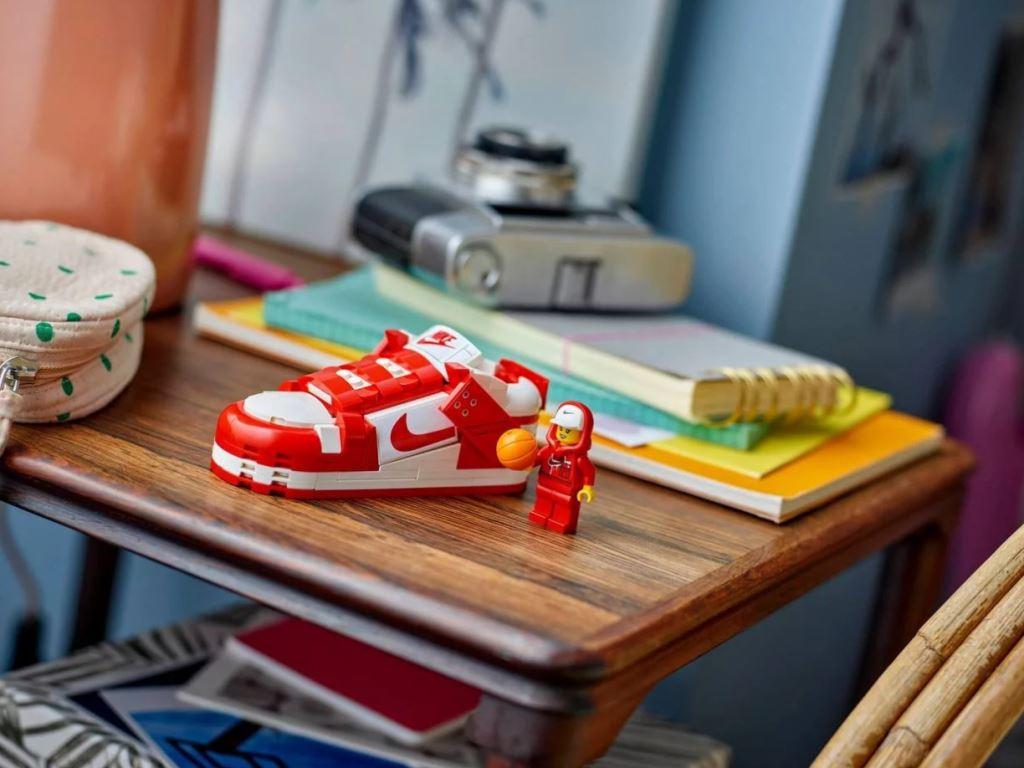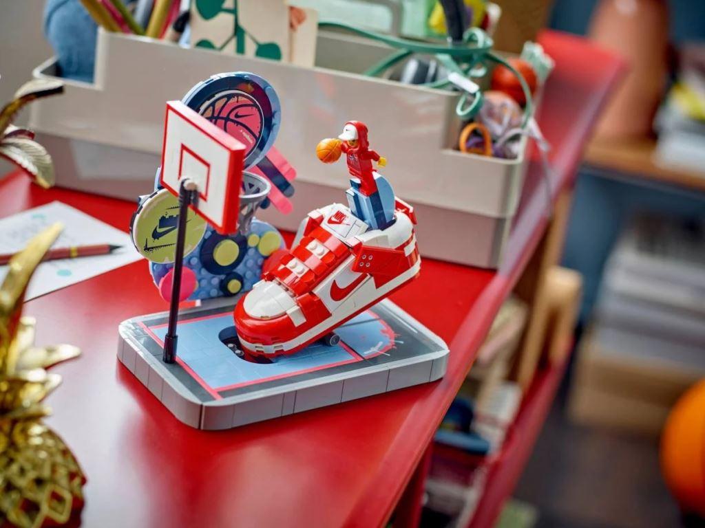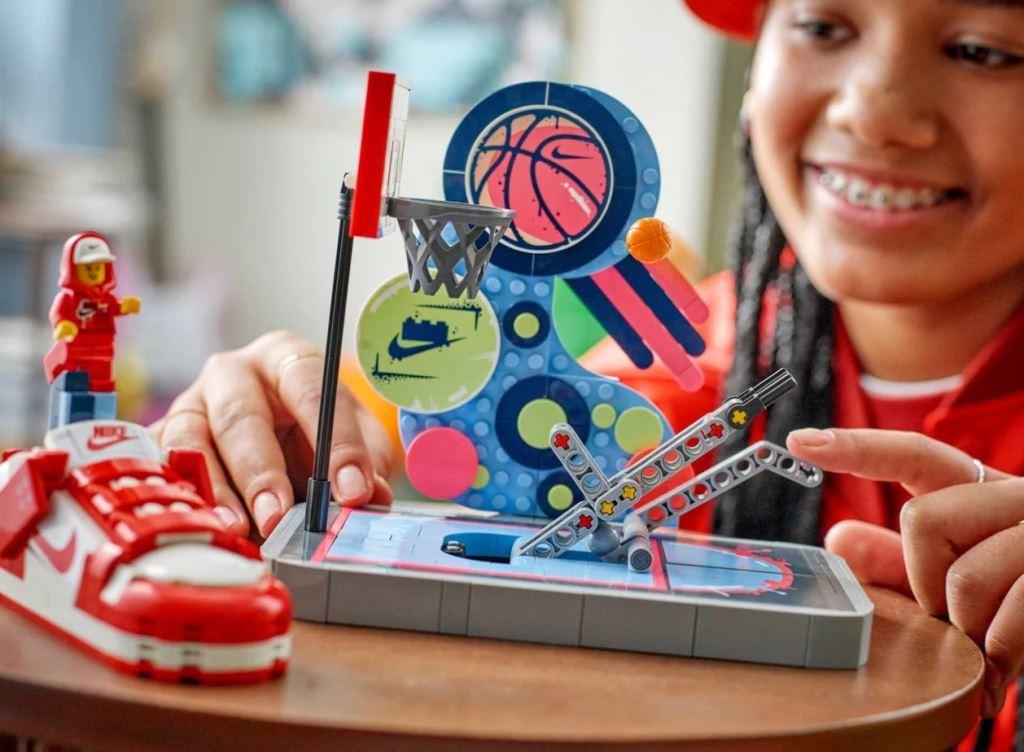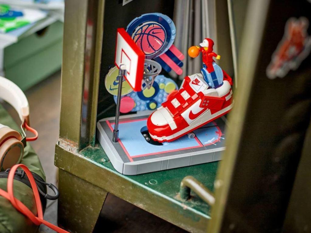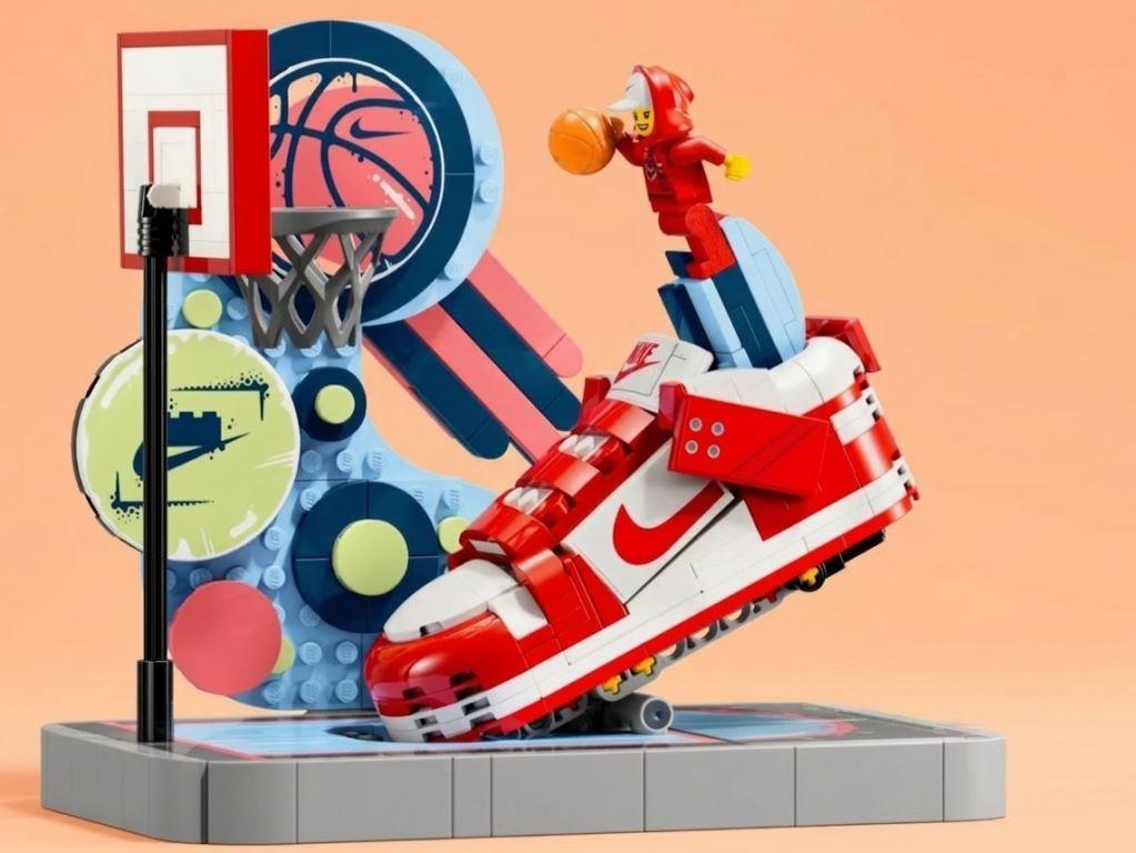 Любители баскетбола могут создать крутую спортивную сценку, а затем забить свой собственный трик-шот. Кроссовок основан на культовом дизайне Найк Данк и даже представлен в той же цветовой гамме, что и оригинальные кроссовки. Но это больше, чем просто модель кроссовок — у него есть мини-рычаг, который можно нажать, чтобы имитировать бросок сверху, и который можно снять с модели, чтобы создать свою собственную баскетбольную игру. Сцену оживляет эксклюзивная минифигурка с двумя вариантами головы и толстовкой.