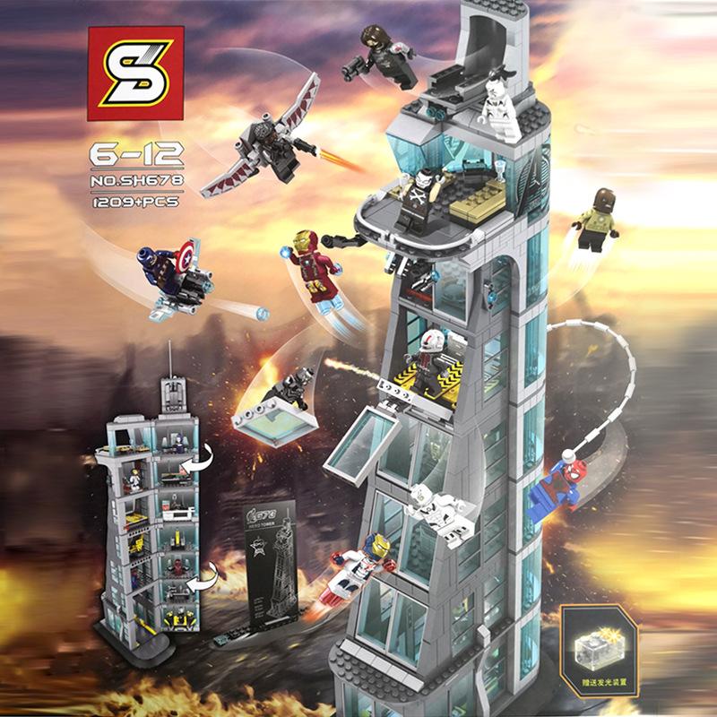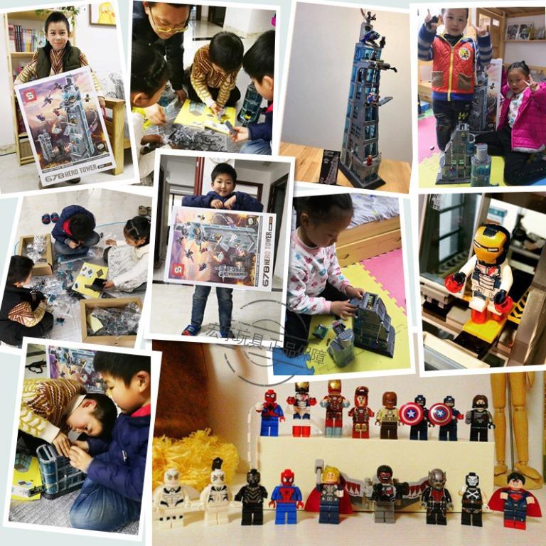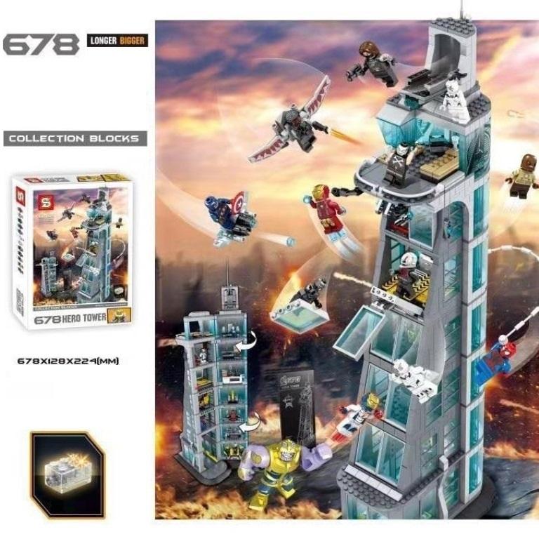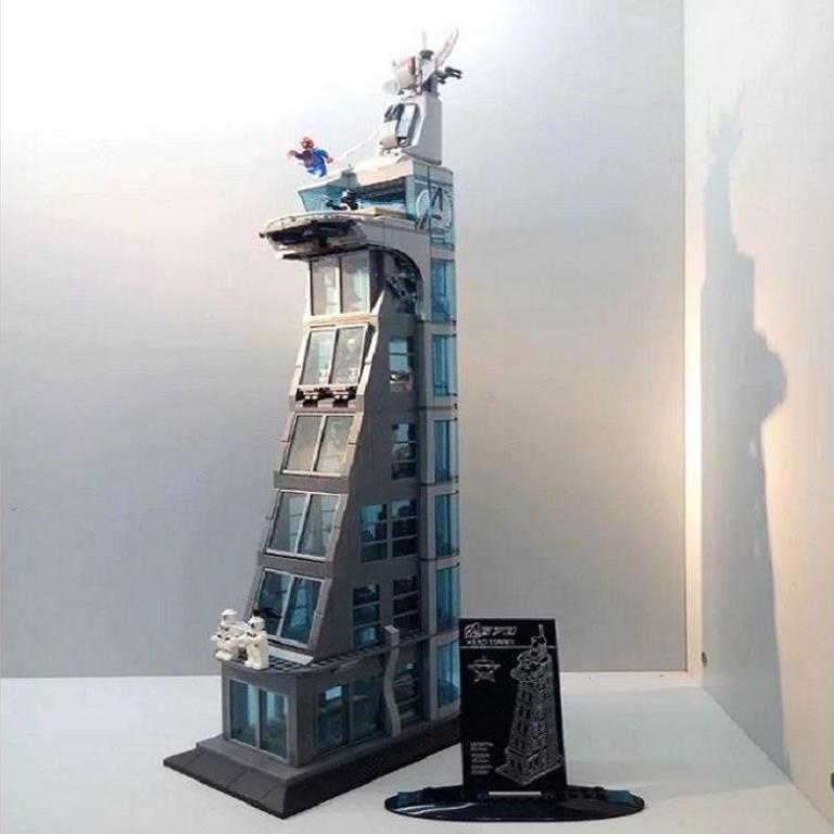 Модель башни Мстителей, построенная из «кирпичиков» этого конструктора, получается очень даже реалистичной. Созданию хорошей детализации восьмиэтажного сооружения поспособствовали большие размеры модели: в собранном виде высота здания составит 62 см, а основание будет прямоугольником в соотношении 13х22см. Выглядит башня грандиозно. В конструкции игрушки достаточно много прозрачных элементов, которые отлично имитируют стеклянные окна. На самом верху сооружения с логотипом Мстителей располагается пентхаус, который имеет открытую площадку и балкон. По игровому сюжету, именно там оказываются на вечеринке супергерои, когда они узнают о нападении на башню. В этом роскошном помещении, под одним из двух диванов, есть тайник со стрелковым оружием. Стены модели из набора оборудованы механизмом разделения – они раскрываются, как книжка. Так что у играющего есть возможность не только видеть здание с внешней стороны, но и попасть внутрь помещений на каждом этаже. После этого можно увидеть всё внутреннее обустройство башни. Первый этаж занимают: -хранилище для боевых костюмов в больших закрытых боксах. Открываются они выдвижением стёкол – но во время захвата управления Альтроном, роботы ломают свои камеры. -медицинский пункт-лазарет – сюда можно будет доставлять раненых персонажей. Пункт оборудован кушеткой, капельницей, шприцом, тумбой с выдвижными ящиками и монитором, демонстрирующим состояние пациента. Этажом выше в здании располагается лаборатория – именно в ней до возникновения чрезвычайной ситуации содержали Альтрона. В помещении с барьером находится вращающаяся платформа, два подвижных лазера. Выбраться из лаборатории можно, нажав на спецрычаги, после чего панорамное окно выпадает, и злодей оказывается на свободе. Кроме всего перечисленного, ещё есть комната управления, в отдельном помещении хранится посох Локи и секретный ангар с беспилотником.