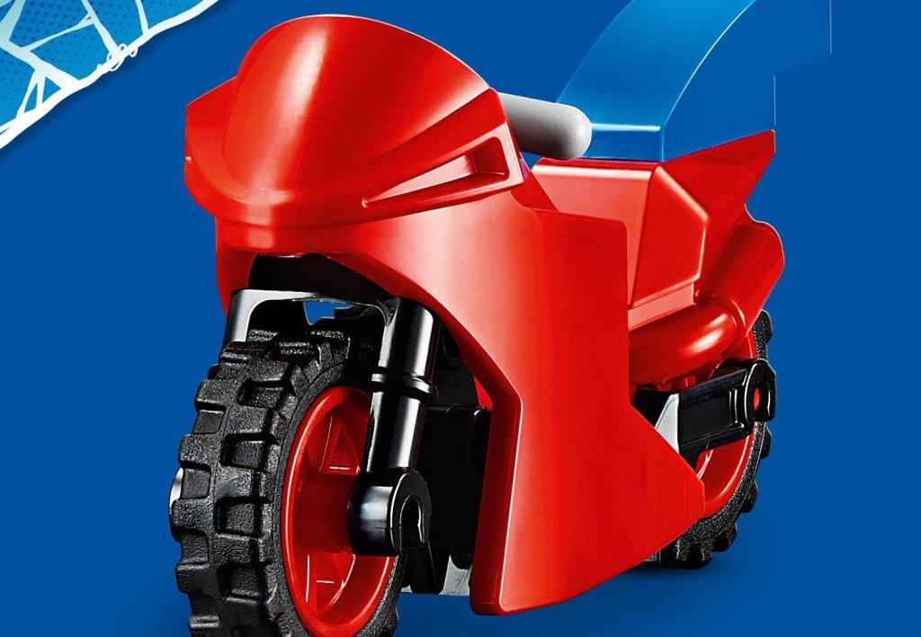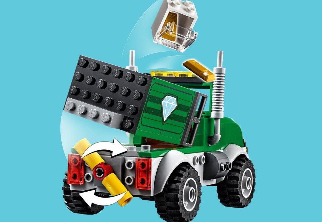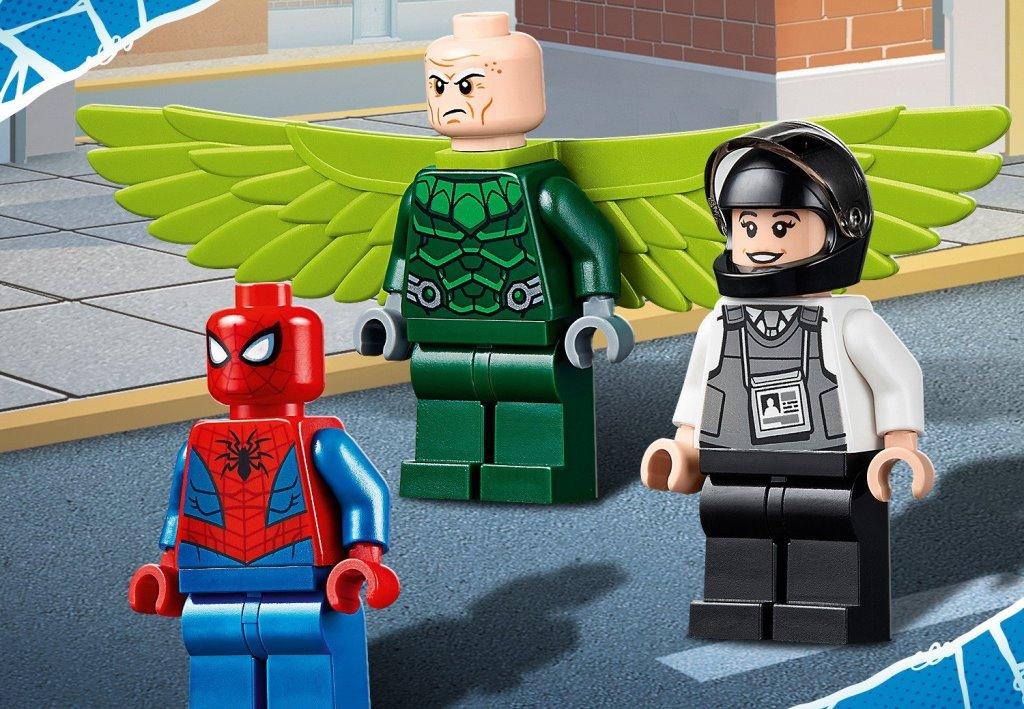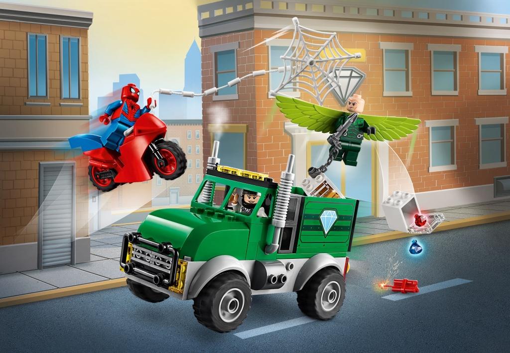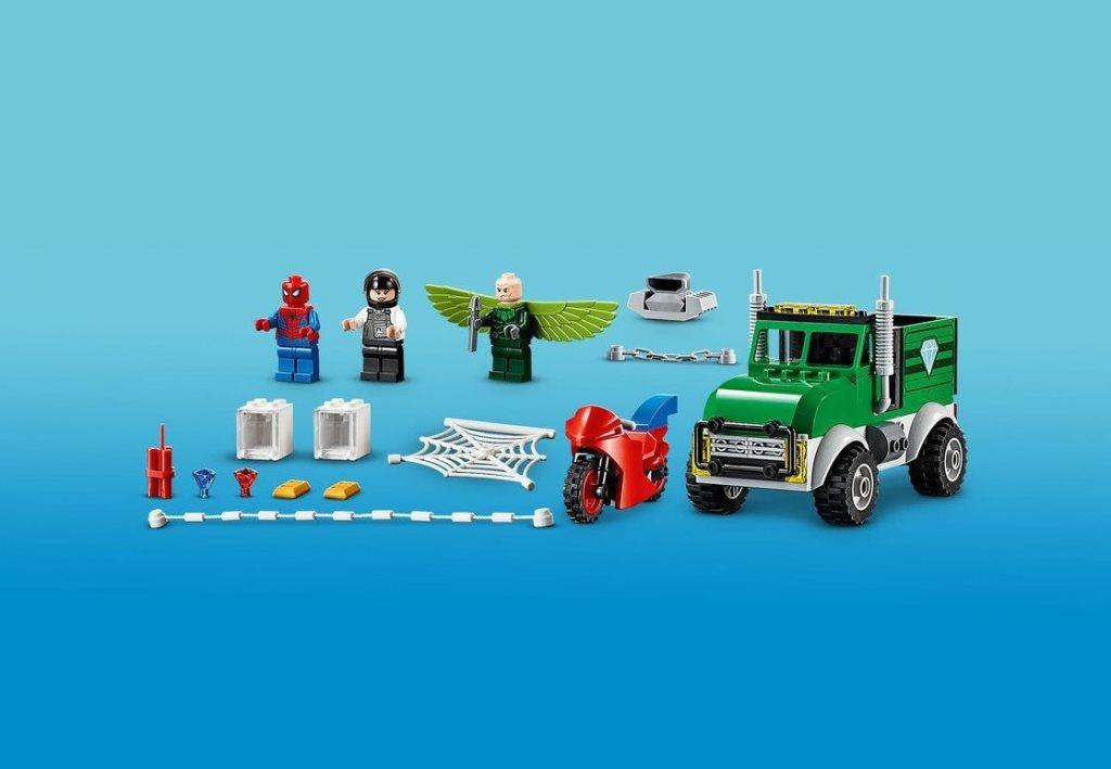Жадный Стервятник узнал, что банковским грузовиком перевозят слитки золота и драгоценности. План обокрасть автомобиль созрел быстро. Суперзлодей надел свои огромные крылья и за пару минут долетел до машины. Он приземляется на фургон, взламывает двери и забирает ящики, скрепленные цепью. Неужели Ограбление Стервятника никто не остановит? У злостного вора ничего не получится. Человек-Паук уже едет на своем суперскоростном мотоцикле прямо на место преступления. От испуга Стервятник выбрасывает украденное добро. С конструктором можно собрать два транспортных средства — банковский грузовик и мотоцикл Человека-Паука. Отличный набор техники для фантастических приключений и захватывающих погонь. Зеленый автомобиль с большой водительской кабиной, просторным грузовым отсеком – то, что нужно для перевозки денег и драгоценностей. Он быстро ездит, а благодаря мощным колесам с глубокими протекторами обладает хорошей проходимостью. Сможет проехать по трассе, песку, дорогам с ямами и ухабами. В кузове машины умещается несколько коробок с драгоценностями. К тому же фургон откидной. Чтобы его поднять, сзади авто расположен специальный рычаг. В наборе есть минифигурка водителя, который занимается перевозкой ценных грузов. Герой одет в бронежилет, черные штаны, а на голове — защитный шлем. То, что мотоцикл принадлежит Человеку-Пауку, понятно сразу. Его корпус выполнен в красно-синих цветах, как и сама минифигурка супергероя. Мотоцикл движется с молниеносной скоростью, поэтому персонаж всегда оказывается быстрее всех в нужном месте. Человек-Паук прихватил с собой большую липкую паутину. От этого оружия не могут спастись такие ловкие преступники, как Стервятник с его огромными зелеными крыльями. Собирай транспорт из деталей, загружай ящики с золотом, драгоценностями в грузовик и отправляйся в увлекательное путешествие. Даже если у Стервятника получится ограбить машину, далеко он не улетит.