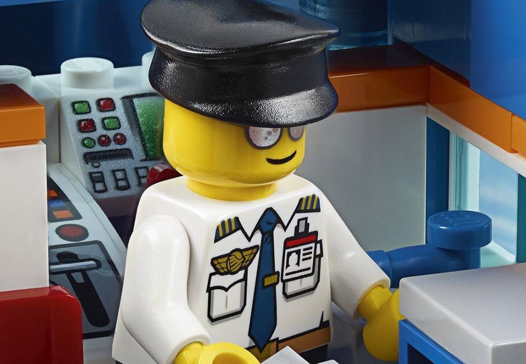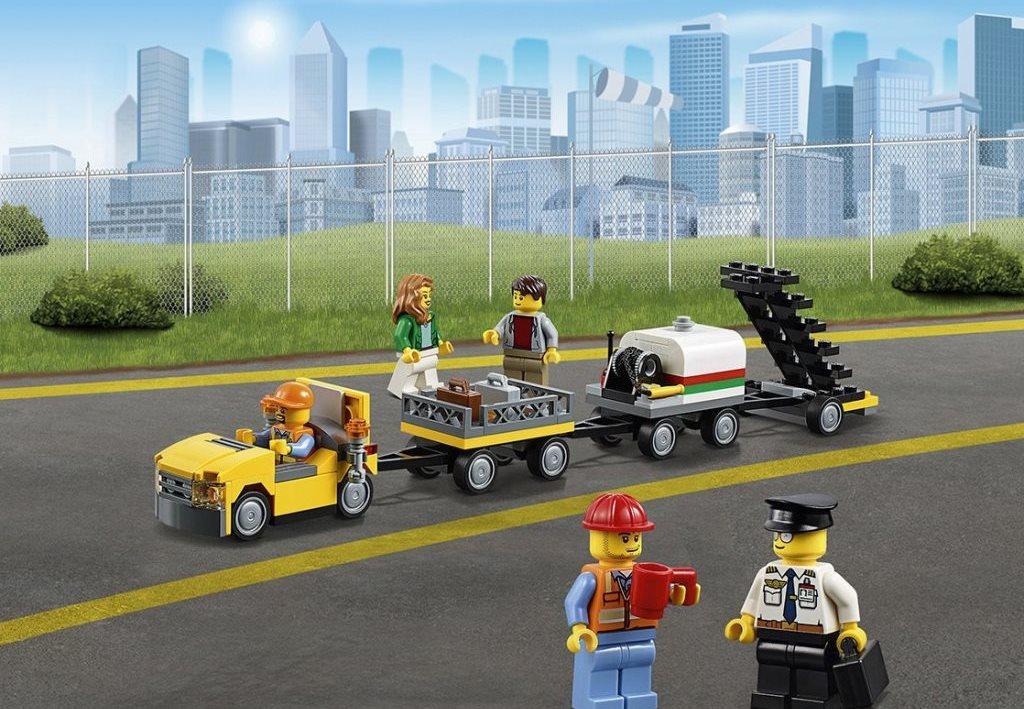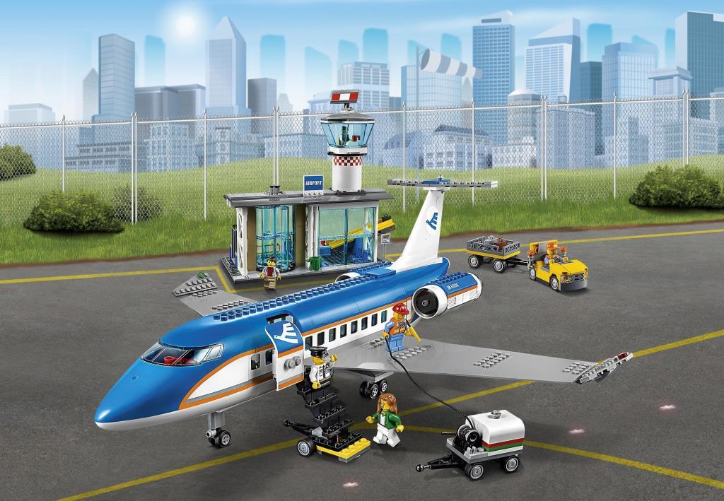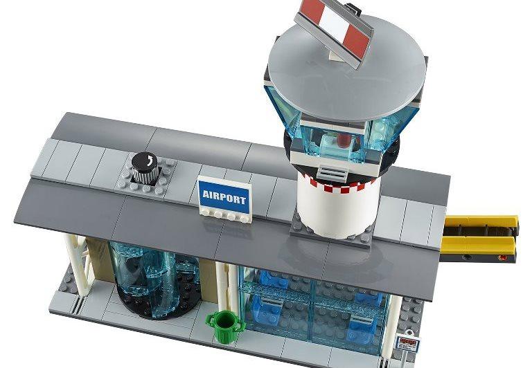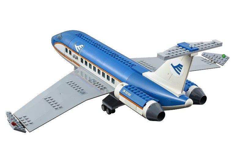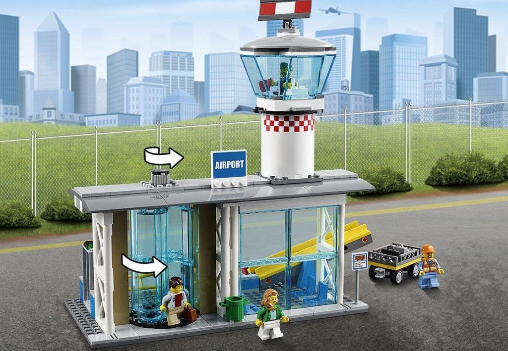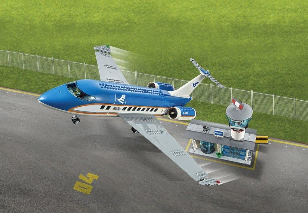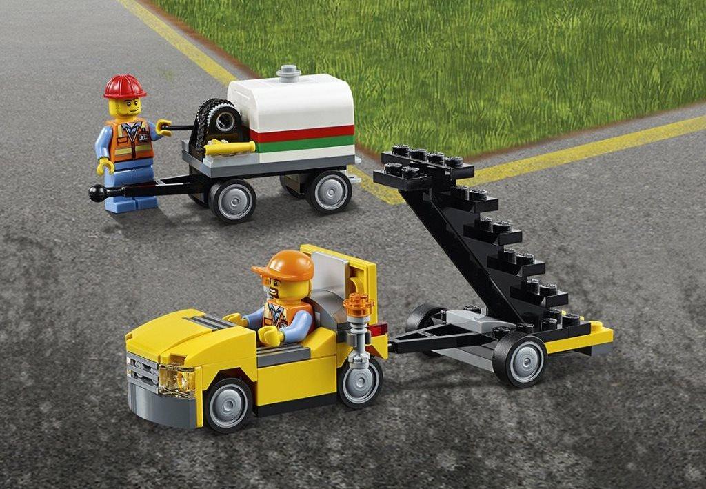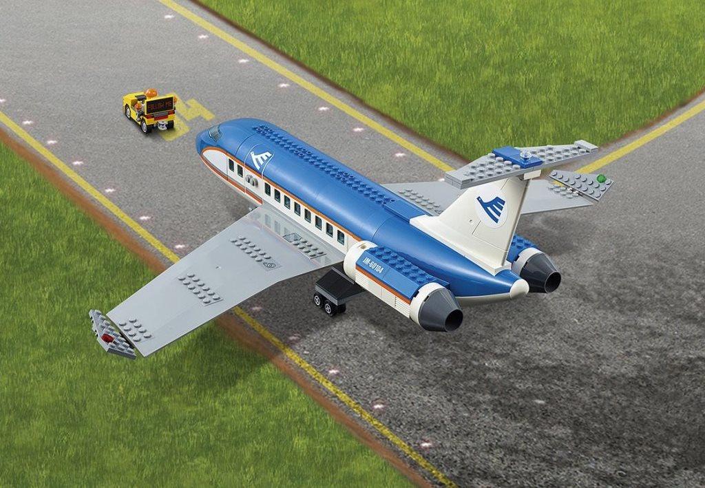 Пассажирский терминал из набора представляет собой двухэтажное здание с белыми стенами и серой крышей. Главной особенностью фасада служат панорамные голубые окна, через которые открывается вид на взлётно-посадочную полосу. Перед входом организована небольшая площадка с мусорным баком и автобусной остановкой. Пройдя через вращающиеся стеклянные двери, можно очутиться внутри терминала и рассмотреть его интерьер. Здесь есть рамка металлоискателя с сигнальными огнями, просторный зал ожидания с удобными креслами, пункт досмотра багажа со столом, стулом и монитором, а также длинная конвейерная лента. По ней, повинуясь движению специального рычага, чемоданы перемещаются к зоне вылета, где их аккуратно загружают в жёлтый сервисный автомобиль и подвозят к самолёту. Сотрудники аэропорта работают чётко и слажено, чтобы ничего не перепутать и не допустить задержки рейсов. За всем происходящим на территории воздушной гавани следит авиадиспетчер. Его рабочее место располагается в дозорной вышке, оборудованной системой датчиков и вращающейся антенной. Размер терминала в собранном виде составляет 28х31х12 см. Также из деталей набора Вы сможете собрать масштабную модель самолёта. Его фюзеляж выполнен из сине-белых деталей с добавлением контрастных оранжевых полос. По бокам видны длинные серые крылья с подвижными закрылками и сигнальными огнями. Под днищем установлено надёжное шасси, имеющие три точки опоры. Крыша самолёта состоит из нескольких секций, которые можно снять и рассмотреть интерьер. В носовой части устроена кабина пилота с закруглённым ветровым стеклом и приборной панелью. За ней предусмотрен проход во вместительный салон, в котором есть всё необходимое для комфортного путешествия: удобные кресла, прозрачные иллюминаторы, кухонный уголок для приготовления закусок и туалетная комната. Во время посадки пассажиров в самолёт можно использовать передвижной лестничный трап. Он ловко маневрирует по взлётной полосе и подъезжает точно к входной двери.