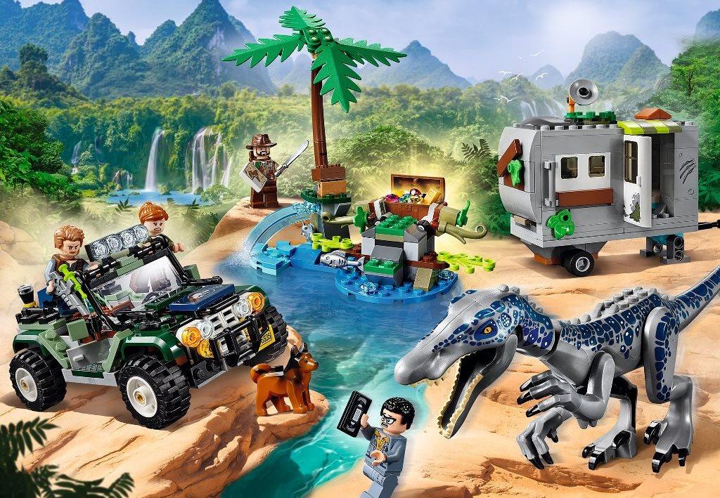 С героями набора отправляйся в джунгли на поиски сундука с сокровищами, но остерегайся злобного динозавра Барионикса, которого сотрудники Парка Юрского Периода выпустили на свободу вместе с другими динозаврами. Из деталей набора собирается локация в джунглях, в которой героям предстоит отыскать сундук с сокровищами, устроив полную приключений гонку с соперниками по джунглям. Набор включает следующие объекты и постройки: -внедорожник, предназначенный для удобного путешествия двух героев. Он оснащен вместительным багажником и прицепным устройством, с помощью которого буксирует прицеп; -трейлер, который имеет открывающуюся дверь, скрывающую внутреннее убранство прицепа - довольно детализированный интерьер с кроватью и компьютером. Внутри расположены аксессуары, делающие путешествие путников более комфортным: сковорода, чашка для напитков, видеокамера. На крыше трейлера установлена антенна для связи с внешним миром; -джунгли представлены сборной моделью пальмы, в основании которой расположен скрытый сундук с сокровищами. Чтобы добыть сундук, нужно нажать на специальный рычаг, который активизирует механизм, скрывающий сокровища от посторонних глаз. В набор входят минифигурки: Оуэна Грейди; Клэр Диринг; Денни Недермейера; Сиджина Прескотта. Любителям динозавров непременно стоит купить набор, ведь в него входит сборная фигурка динозавра Барионикса, у которой имеются подвижные передние и задние лапы, захлопывающаяся нижняя челюсть. Замечательно выполненная фигурка наверняка станет украшением игровой коллекции. Также в набор включена фигурка пса по кличке Рэд. Размеры собираемых объектов набора в высоту, длину и ширину соответственно составляют: внедорожника – 7х13х8 см; трейлера – 10х14х5 см; растительности джунглей – 14х14х8 см; динозавра Барионикса – 12х28х4.
