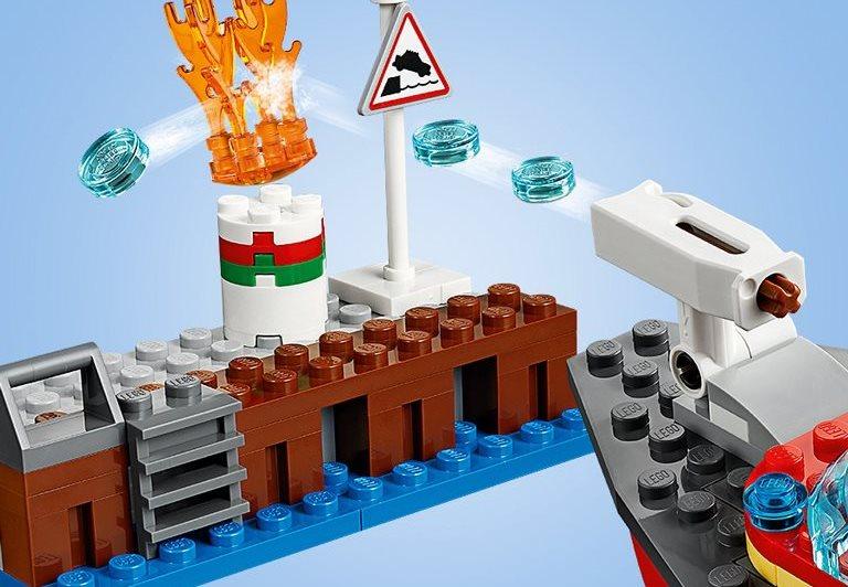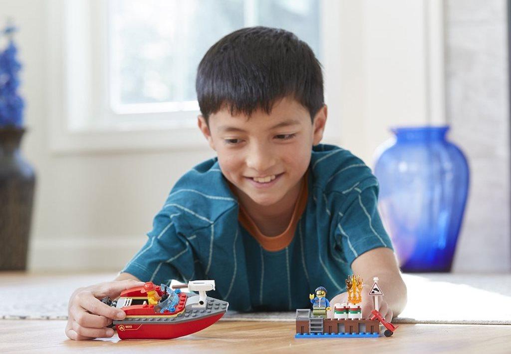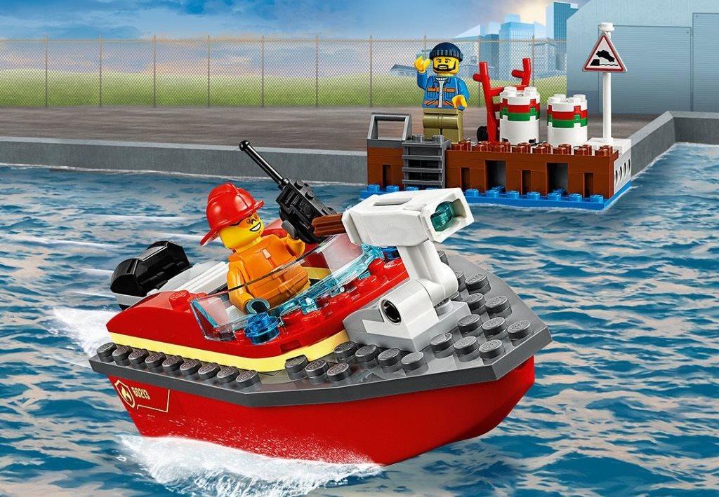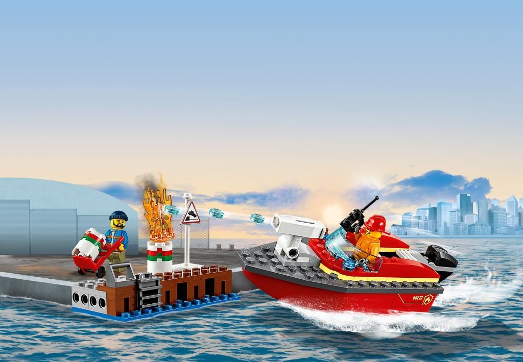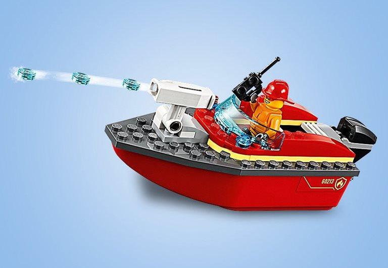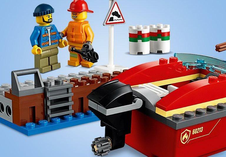Несмотря на приемлемую цену, конструктор включает в себя немало элементов и аксессуаров для игры, в том числе моторную лодку, которая может сама плыть и стрелять водными зарядами по огню. Каждый хочет почувствовать себя спасателем и героем, который предотвратил серьёзное бедствие. Конструктор Лего 60213 как раз даёт такую возможность, разыграв спасательную операцию в порту по тушению внезапного огня. Особенностью набора является то, что это не простая пожарная команда, а специальный водный катер, который на самом деле может плыть, оснащенный водяной пушкой и четырьмя зарядами. В процессе разгрузки нефтяных баррелей, что-то пошло не так, и одна из бочек сильно разгорелась. Но рабочий не растерялся и вызвал спасательный катер по рации с опытным пожарным за штурвалом. Пушка заряжена, мотор опущен, скорее спасать причал от возможной катастрофы. Каждая из фигурок набора выполнена в соответствующем стиле, пожарный одет в огнеупорный плащ, спасательную жилетку и пожарный шлем, а в руках у него рация. Работник причала одет в рабочую одежду, спасающий вторую бочку, и перевозящий её с помощью своей тележки, чтобы пламя не перекинулась и на неё. Из аксессуаров в набор также входит предупреждающий знак и само пламя. Размеры построек Пожар в порту: пожарный катер: 13х5х6 см; причал: 9х3х4 см.