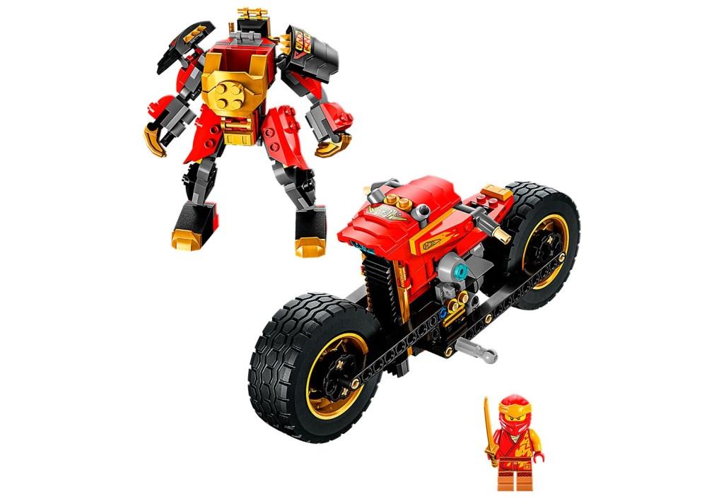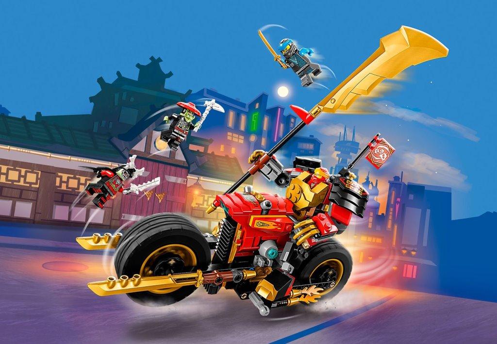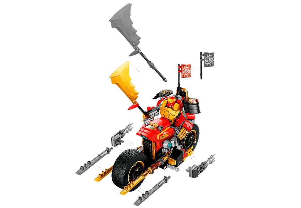 Набор из серии Ниндзяго включает в себя механического робота ЭВО Кая на мотоцикле и 4 минифигурки персонажей. Собирайте мощный мотоцикл для меха, усаживайте его за руль и отправляйтесь завоевывать знамя победителя у сил зла. Большие колеса помогут преодолеть любые препятствия и бездорожье, два золотых клинка по бокам добавляют боевой силы, а две турбины – скорости. Благодаря шарнирным соединениям, у робота подвижны ноги, руки и даже пальцы. В руках мех может удерживать свой большой золотой меч, а на его спине предусмотрено место для крепления флагштока со знаменем. Управляет боевой машиной Кай, который располагается в открытой кабине пилота, заменяющей голову меха. Вместе с храбрыми ниндзя и их механическим роботом-гонщиком ЭВО одолейте костяного короля и его помощника, помогите добру восторжествовать. В комплект Механический робот-гонщик ЭВО входят 4 минифигурки с оружием: Кай с золотой катаной, Ния с золотой катаной, костяной король с мечом и костяной охотник с мечом и косой. Размеры мотоцикл в собранном виде: 10х25х9 см.