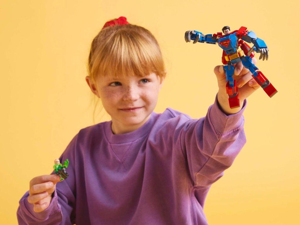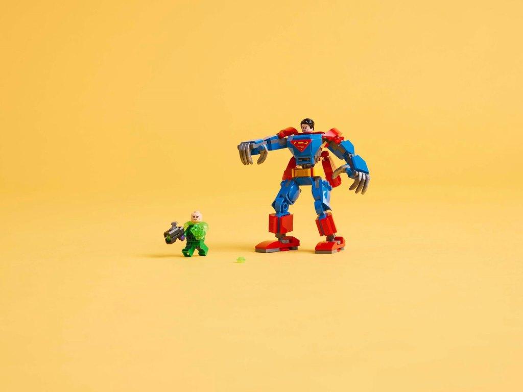 Это выдающийся игровой набор с роботом, созданный для поклонников супергеройских боевиков и приключенческих игрушек в возрасте от 6 лет и старше. Сборный робот имеет подвижные руки, ноги и пальцы, а его туловище открывается, демонстрируя кабину, в которой может поместиться минифигурка Супермена. На спине робота есть 2 регулируемых двигателя, которые позволяют ему «летать». Также в набор входят 2 минифигурки: Супермен в тканевом плаще и с двухсторонней головой, демонстрирующей альтернативные выражения, и Лекс Лютор с шипометом и кристаллом Криптонит.
