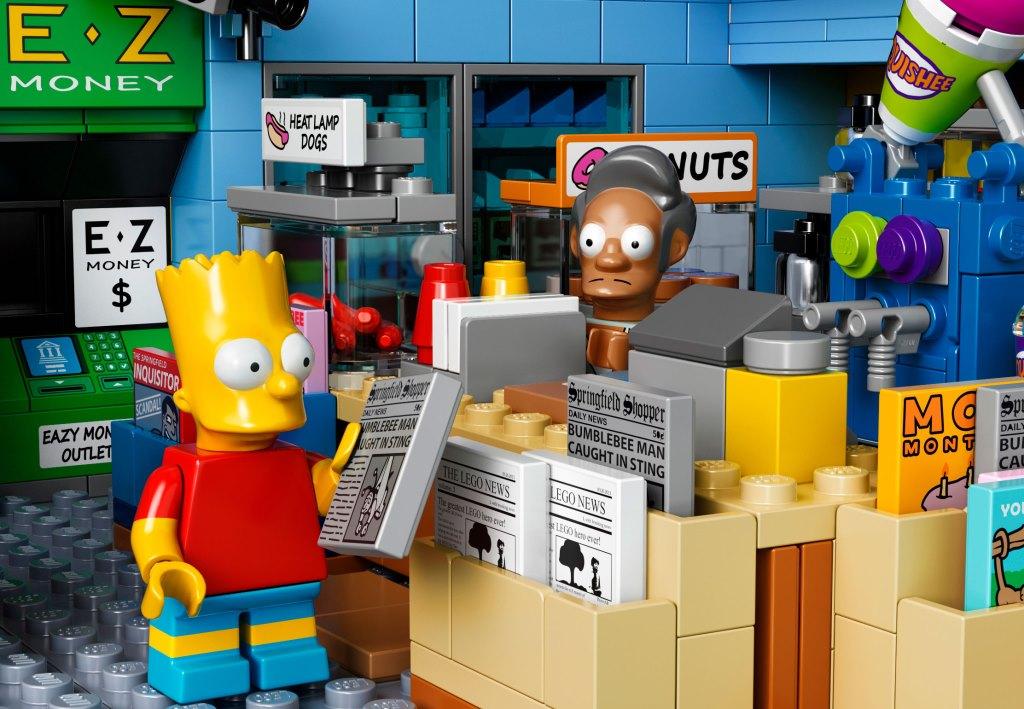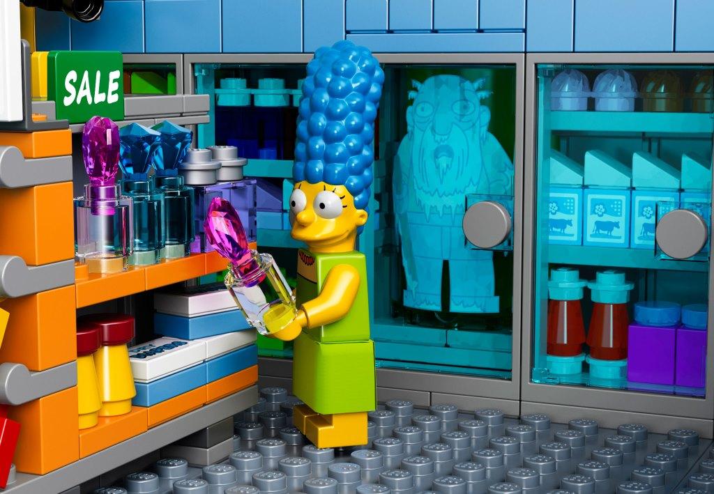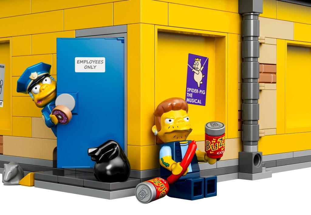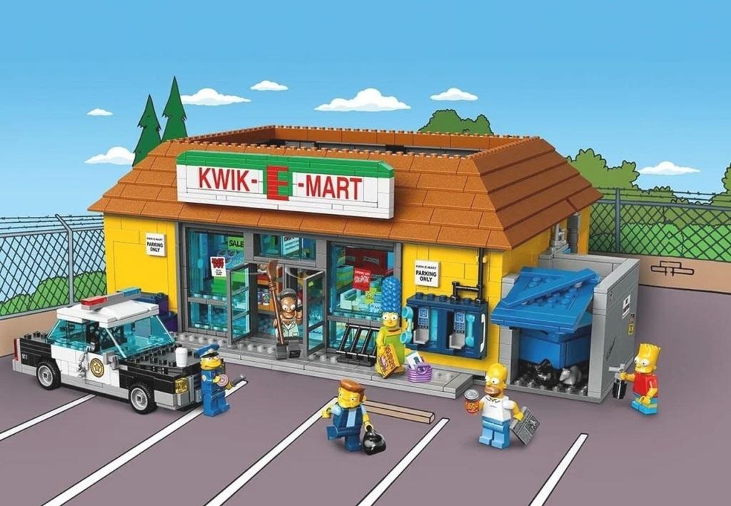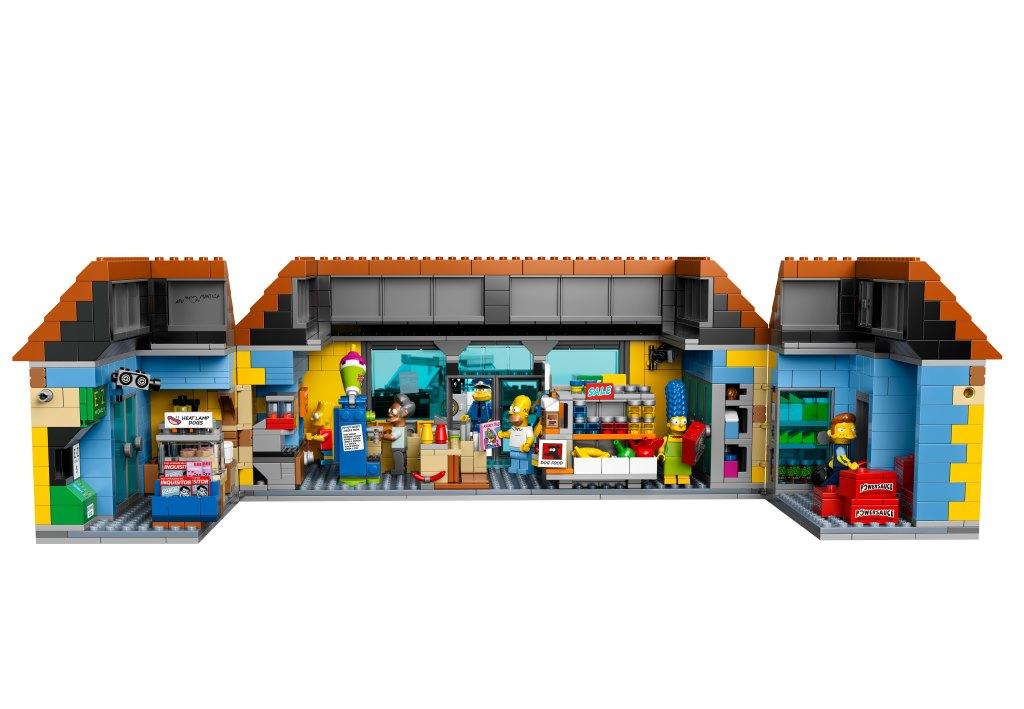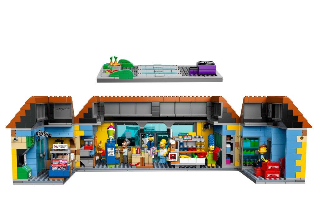 Посетите магазин «На скорую руку», являющийся самым главным супермаркетом Спрингфилда. Только здесь Вы найдёте множество повседневных товаров по завышенным ценам! Модель магазина из набора выполнена из ярко-жёлтых деталей, надёжно закреплённых на сером фундаменте. Коричневая крыша, состоящая из пяти ярусов, украшена огромной вывеской, заметной издалека. Сверху, рядом с системой вентиляции организован небольшой садик Апу Нахасапимапетилона – хозяина супермаркета. В нём заботливо выращены овощи, зелень и фрукты. Главный вход в магазин представляет собой систему панорамных голубоватых окон и двух открывающихся дверей. Слева от них виден склад с фиолетовыми ящиками, а справа – парковка для велосипедов, 2 телефона-автомата и огороженная территория для бытовых отходов. Передняя стенка, закрывающая проход к мусорному контейнеру, может подниматься, а на боковой бетонной стене красуется граффити Барта Симпсона. Благодаря распашной конструкции и съёмной крыше, можно детально рассмотреть интерьер магазина и устроить реалистичный поход за покупками. Внутри Вы найдёте несколько отделов с самыми необходимыми товарами. Справа, под знаменитой табличкой «Вчерашние продукты по завтрашним ценам» размещены полки с косметическими товарами, подгузниками, печеньями, пирожными, супами быстрого приготовления и хлопьями для завтрака, выпускаемыми клоуном Красти. Рядом, на стеллаже с табличкой «Распродажа» видны разноцветные ёмкости для хранения, еда для собак, шоколадное молоко, овощи и фрукты. Напротив, в многочисленных холодильниках выставлены напитки и закуски, среди которых выделяются пакеты с молоком и галлюциногенная газировка «Базз Кола». Кроме того за стеклом одного из холодильников Вы заметите странного посетителя. Это пенсионер Джаспер Бердли, решивший заморозить себя на некоторое время, пока не настанет «будущее». В левой части магазина организована просторная прикассовая