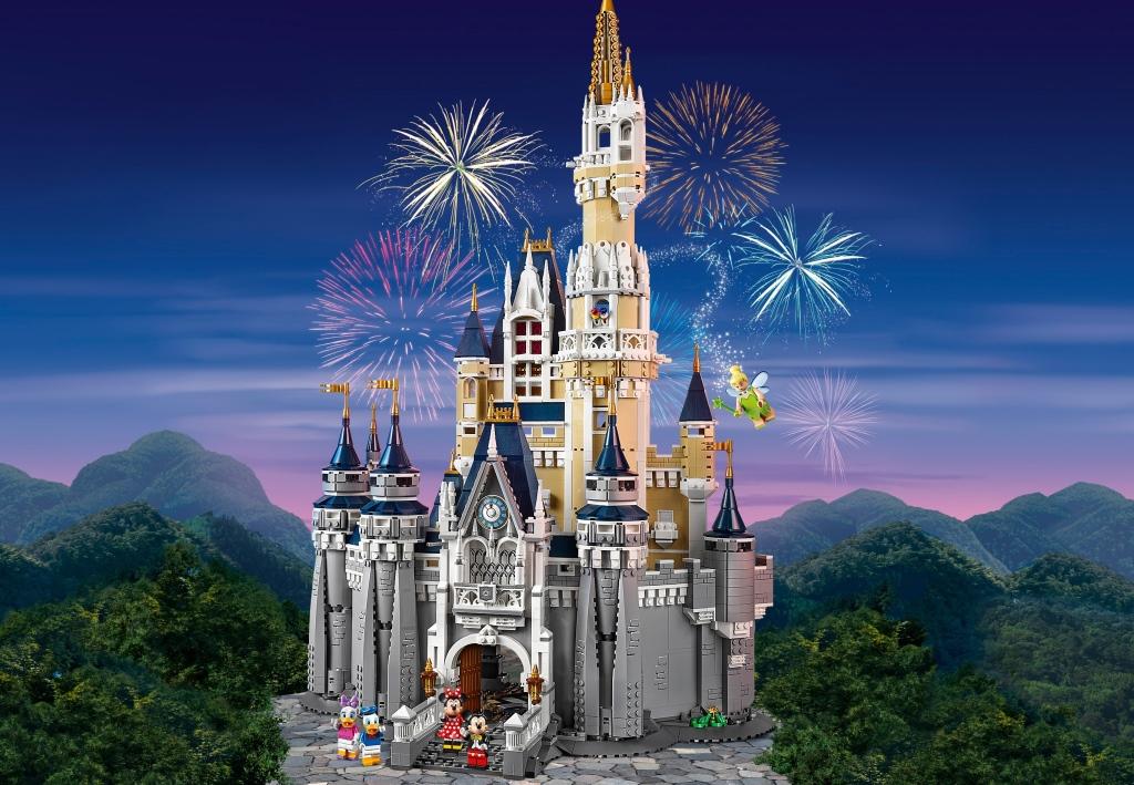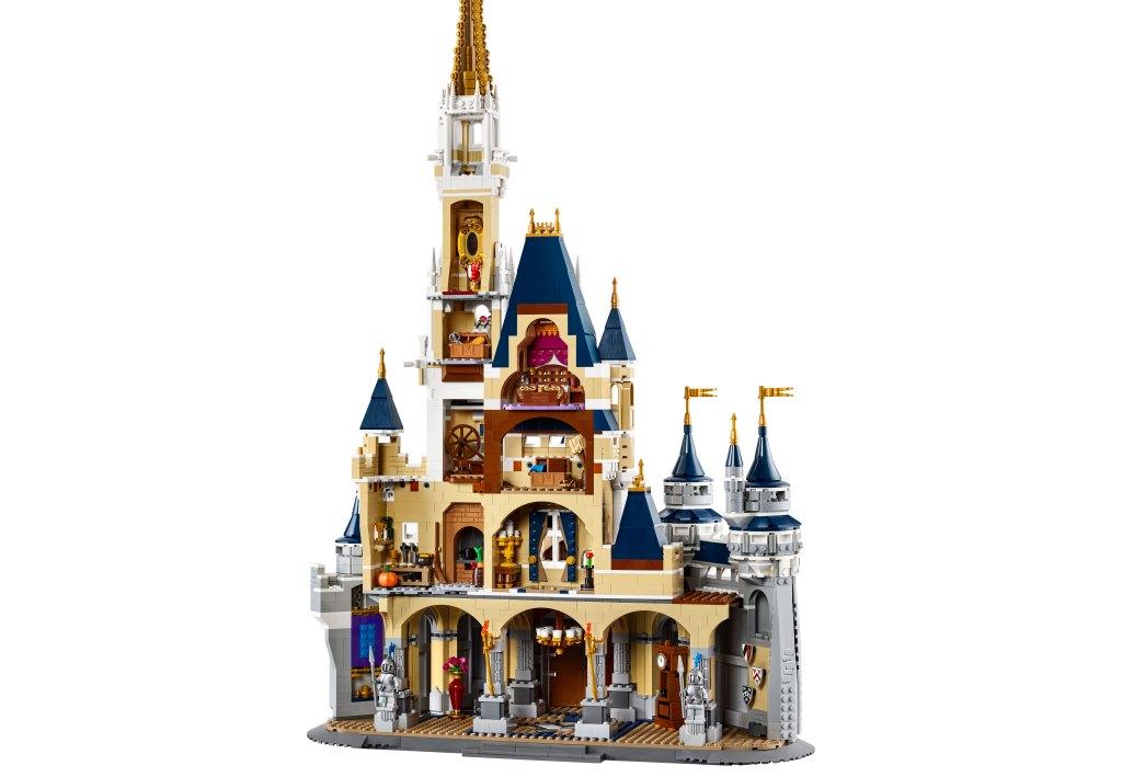 Замок представляет собой масштабную модель главного символа парка развлечений Уолта Диснея в США. Это многоуровневое сооружение спроектировано с огромным вниманием к деталям. В конструкции используются абсолютно новые элементы, созданные специально для данного набора. Их можно встретить как на парадном входе, так и на вершине главной башни, украшенной золотым шпилем. Особого внимания заслуживает фасад замка. Выполненный в стиле средневековой крепости, он имеет эффектное цветовое разделение, соответствующее двум тематическим зонам. Снаружи видна неприступная серая стена с круглыми башенками и развивающимися флагами, а сзади - внутренние песочно-бежевые постройки, скрывающие множество комнат со сказочным интерьером. Чтобы попасть в замок, необходимо пройти через центральные ворота с открывающимися деревянными створками. Перед входом выстроен каменный мост с лестницей, декорированными перилами и светильниками. Над арочными проёмом возвышается королевский балкон с гербом и большими часами, отсчитывающими минуты до наступления полуночи. Следует отметить, что задняя стена балкона состоит из белых блоков с тонким орнаментом, придуманным креативным дизайнером. Это новшество не только гармонично перекликается со стилем замка, но и придаёт ему большей реалистичности. Также интересным дополнением к фасаду служит пара лягушек, сидящих на листьях кувшинки и охраняющих золотую корону. Обратная сторона замка разделена на четыре этажа с множеством комнат. Внизу располагается главный зал с массивной дверью, подвесной люстрой и мозаичным полом. Серые колонны, поддерживающие арочные своды, декорированы длинными факелами и рыцарскими доспехами. В левой части зала видна напольная ваза с цветами и ниша, в которой выставлен ковёр-самолёт и волшебная лампа Аладдина. Напротив находятся старинные часы с маятником и крепления для королевских щитов.