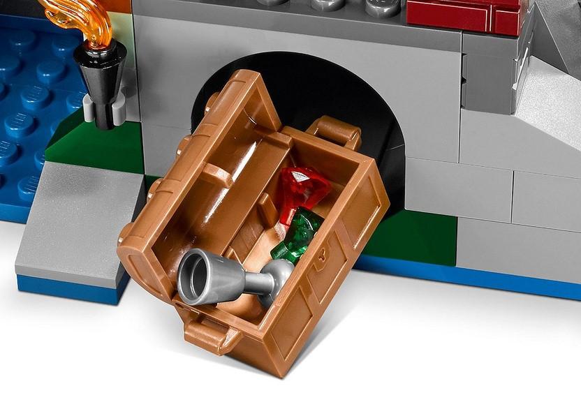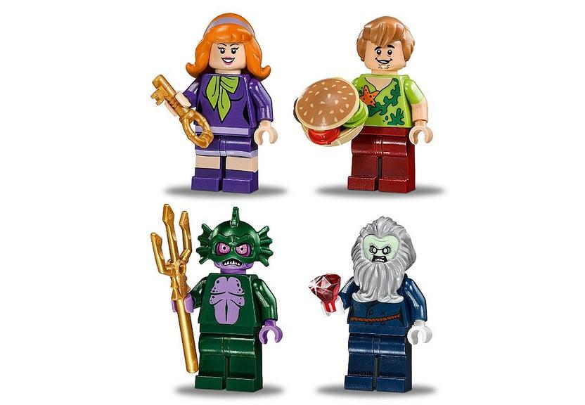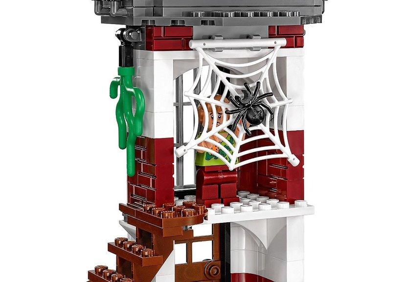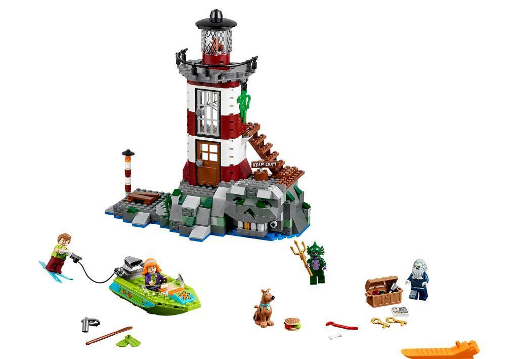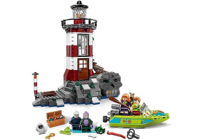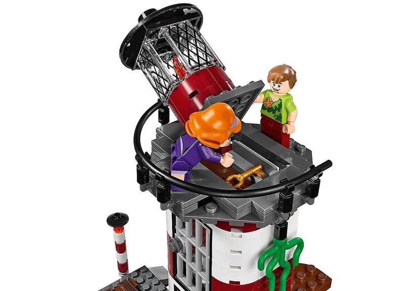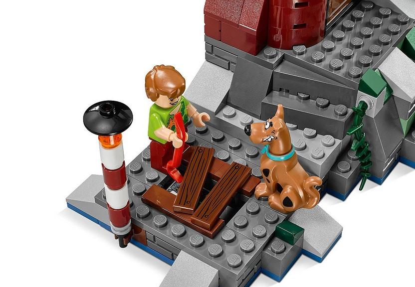 На заброшенном маяке происходят мистические события. Местные жители уверяют, что видели рядом с ним летающих призраков и болотных монстров. Но такие свидетельства очевидцев совсем не пугают юных сыщиков из набора. Используя свою моторную лодку и водные лыжи, они смело плывут к скалистому острову, чтобы разобраться во всех деталях этой таинственной истории. Добравшись до маяка, Дафна сразу нашла карту, спрятанную под деревянным настилом. Это подсказка! На ней указано место расположения золотого ключа, открывающего вход в тайник с сокровищами. Шэгги спешит по деревянной лестнице на вершину маяка, чтобы добыть этот ключ, но попадает в ловушку, расставленную хранителем-призраком. Сыщик оказывается в тюремном помещении, прикрытом прочной паутиной. На помощь другу отправляется Скуби. Используя свой нюх и вечно голодный желудок, он быстро находит кухню, на которой призрак-самозванец готовит себе ужин. После недолгой борьбы преступник оказывается схвачен и обезврежен. Под маской жуткого призрака скрывается хитроумный воришка, который сознаётся в содеянном. Сыщики поднимаются на крышу маяка и под световой камерой находят заветный ключ. С его помощью они открывают подвал и достают из него сундук с украденными сокровищами. Но, праздновать победу ещё рано! Напарник вора-призрака, переодетый в болотного монстра, торопится улизнуть через тайный ход, замаскированный под пиратский череп. Надев ласты и прихватив с собой кислородный баллон, грабитель поворачивает деревянный рычаг и открывает выход из пещеры. Но на его пути оказывается команда сыщиков, готовая вызвать полицию и отправить преступника за решётку. Размер маяка в собранном виде составляет 25х24х12 см. Размер скоростной моторной лодки – 4х13х4 см. В наборе присутствуют 5 минифигурок с аксессуарами: Шэгги, Скуби, Дафна, воришка/призрак маяка и воришка/болотный монстр.
