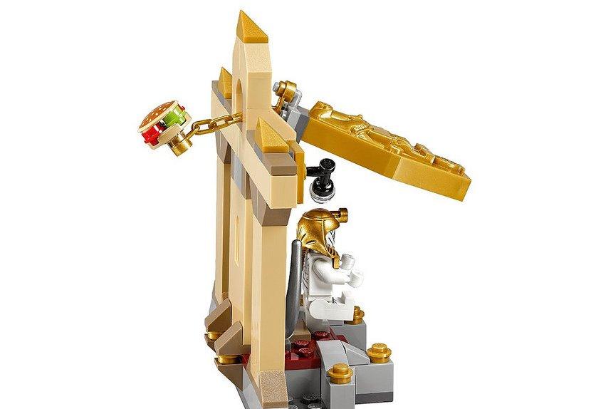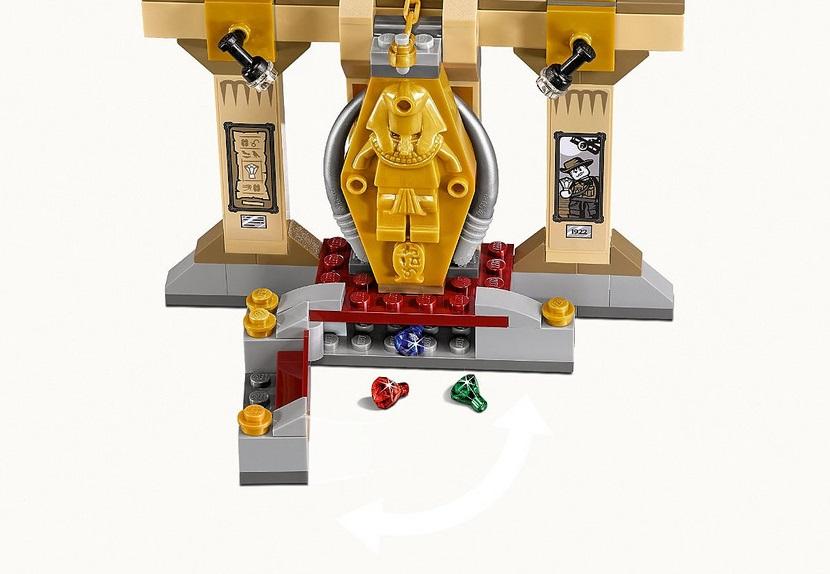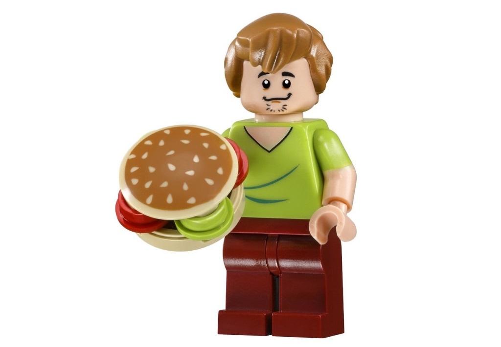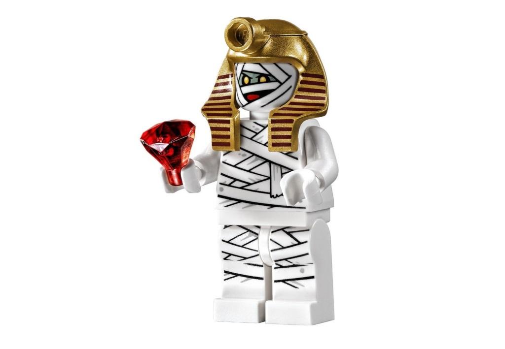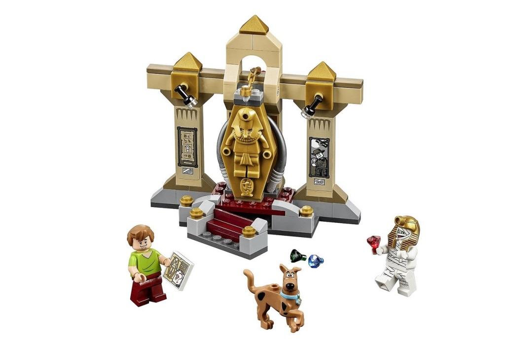 Таинственная кража произошла в музее египетских мумий. Ночью с крышки одного из саркофагов исчезли три больших драгоценных камня, но при этом не было обнаружено никаких следов взлома или проникновения в выставочный зал. Для расследования такого запутанного дела охранники музея обратились к юным сыщикам из корпорации «Тайна». Шэгги и Скуби, приехавшие на место преступления, прохаживались по залам с большой неохотой. Им было страшно, и от этого сильно хотелось кушать. Вдруг Шэгги увидел огромный гамбургер, висящий под потолком зала. Такую возможность нельзя упустить! Герой подпрыгнул и схватил заветную еду, но оказалось, что гамбургер соединён с цепью, потянув за которую можно открыть крышку саркофага. К ужасу сыщиков из гробницы вышла ожившая мумия и направилась в сторону своих освободителей. Завязалась борьба, в результате которой выяснилось, что мумия вовсе не настоящая. Это хитроумный грабитель, обмотанный бинтами, спрятался внутри саркофага и дожидался ночи, чтобы похитить оставшиеся драгоценности. Пойманный на месте преступления, он рассказал, как придумал свой план кражи, и где устроил тайник. Шэгги и Скуби вернули пропавшие бриллианты музею, а также с гордостью сообщили, что самостоятельно раскрыли очередную тайну. В наборе Вы найдёте 3 минифигурки: Шэгги, Скуби и мумия-грабитель, а также множество аксессуаров: гамбургер, карта с подсказками, золотой саркофаг, цепь, 2 прожектора, открывающаяся лестница, 3 драгоценных камня и головной убор мумии. Размер выставочного зала музея мумий в собранном виде составляет 12х12х5см