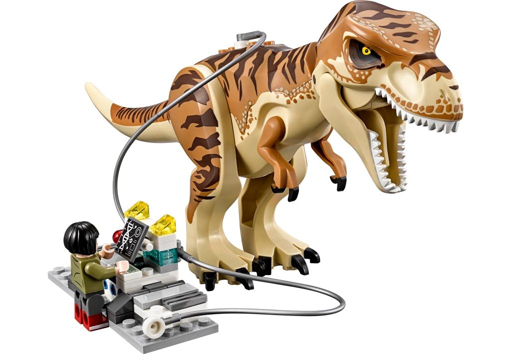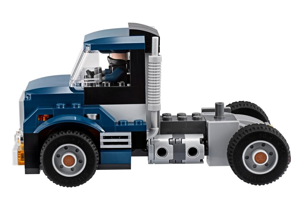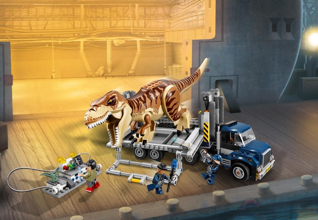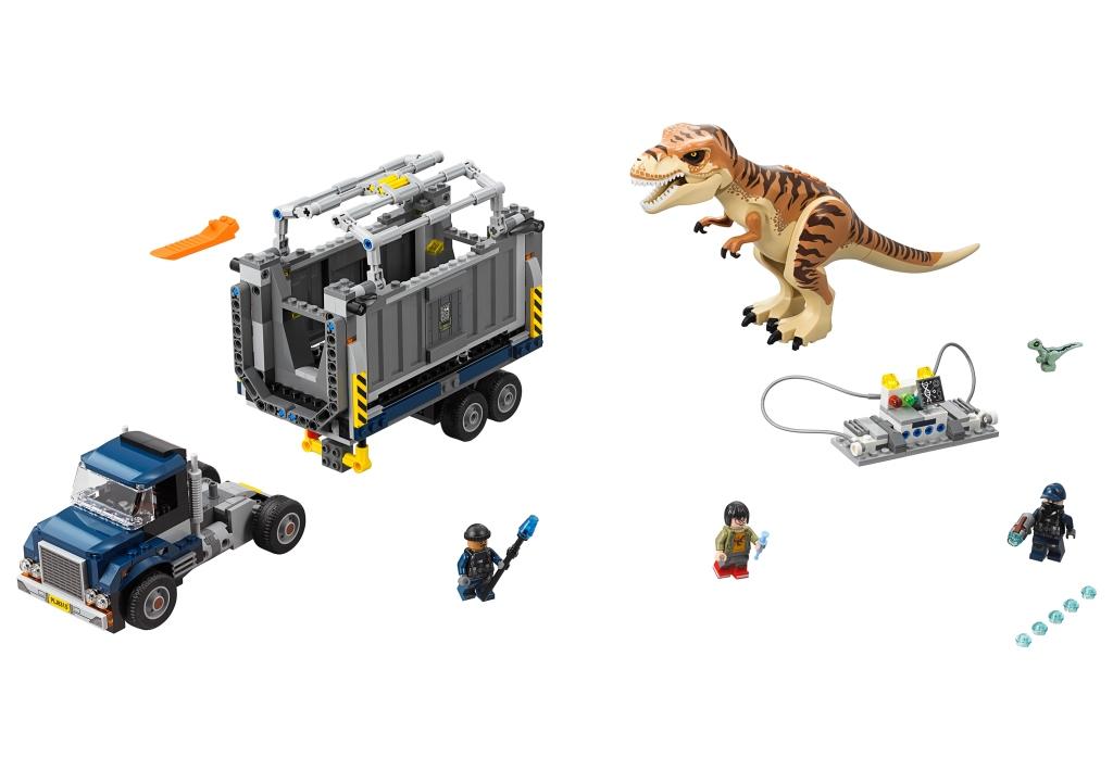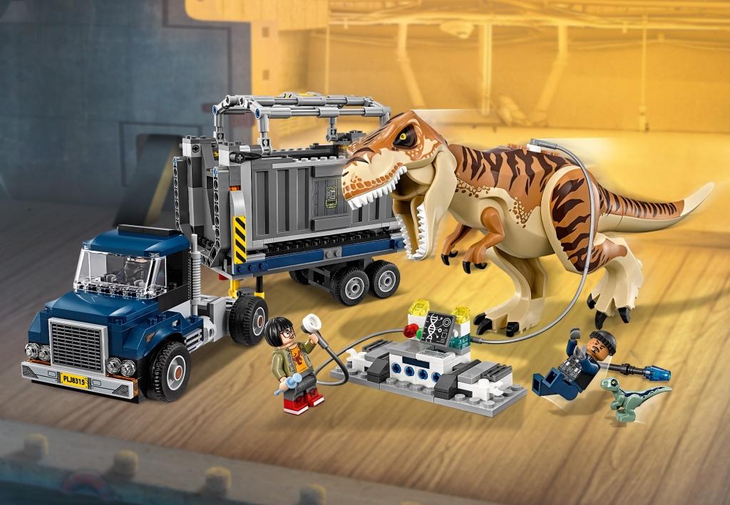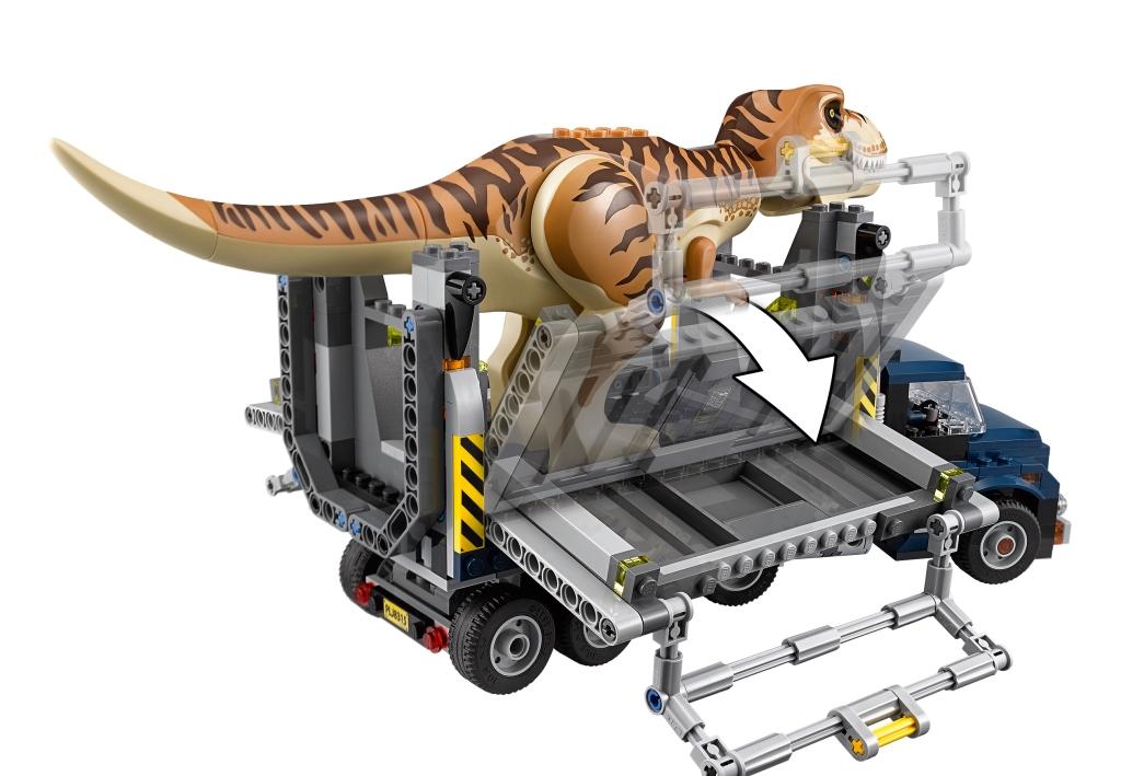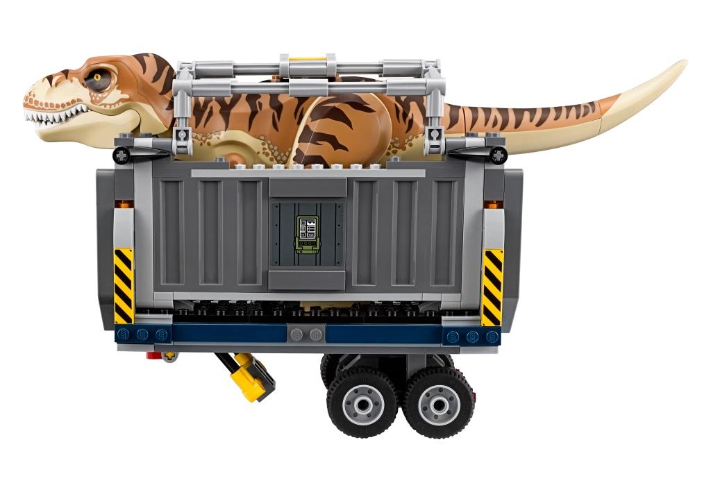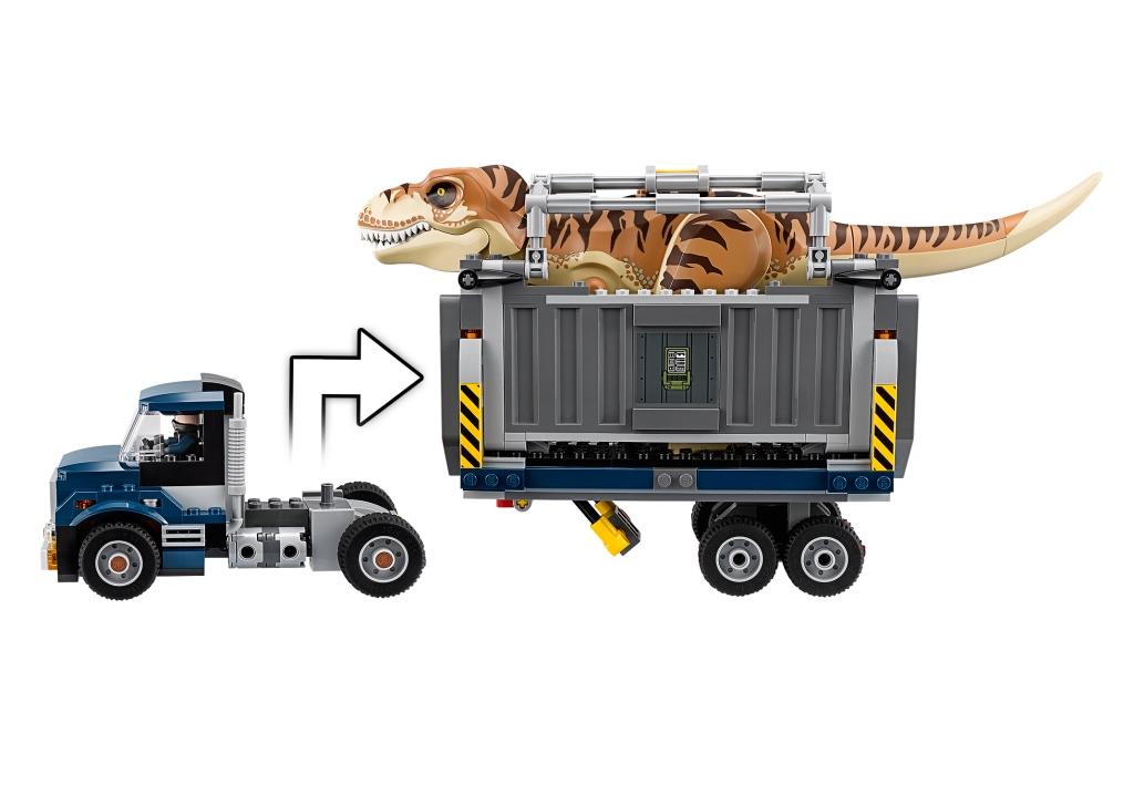 Условия содержания животных в парке динозавров максимально приближены к естественным. Тропический климат, густая растительность и огромная территория позволяют доисторическим ящерам чувствовать себя свободно и вольготно. Они мирно прогуливаются на свежем воздухе и ведут привычный образ жизни. Но внезапно начавшееся извержение вулкана всё изменило. Чтобы сохранить уникальных обитателей парка потребовалась срочная эвакуация. С помощью грузовых вертолётов динозавров доставили с острова на материк, а затем переправили на бронированных автомобилях в безопасное место. Транспортировка больших хищников, таких как Тираннозавр, оказалась наиболее сложной и опасной. Звери никак не хотели подчиниться сотрудникам парка и норовили совершить побег. Утихомирить их мог лишь укол специального снотворного. В наборе Вы найдёте модель грузовика для перевозки Тираннозавра. Его корпус выполнен из серо-синих деталей с добавлением контрастных жёлтых элементов. Спереди располагается массивная кабина, прикрытая закруглённым лобовым стеклом. Сняв часть крыши, можно рассмотреть место водителя и рулевое управление. Перед кабиной виден бронированный капот. Он оборудован квадратной радиаторной решёткой, круглыми фарами и усиленным бампером с номерным знаком. Позади кабины возвышаются вертикальные выхлопные трубы. Задняя часть грузовика представляет собой транспортировочную платформу, базирующуюся на четырёх колёсах. Боковые стенки формируют прочный каркас, напоминающий контейнер. Сигнальные огни и полосатые знаки говорят о том, что внутри находится опасный груз. Чтобы поместить Тираннозавра внутрь контейнера, необходимо открыть специальные засовы и опустить боковые стенки. При этом потолочные решётки превратятся в надёжные опоры, которые зафиксируются на ровной поверхности. Размер грузовика составляет 8х14х8 см, размер прицепа – 19х17х9 см.