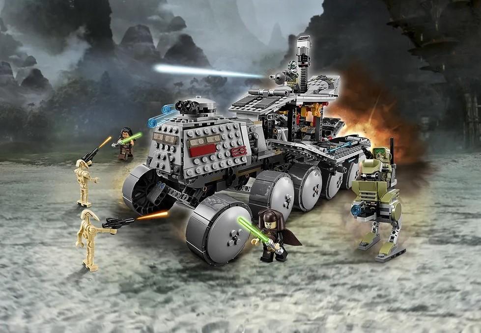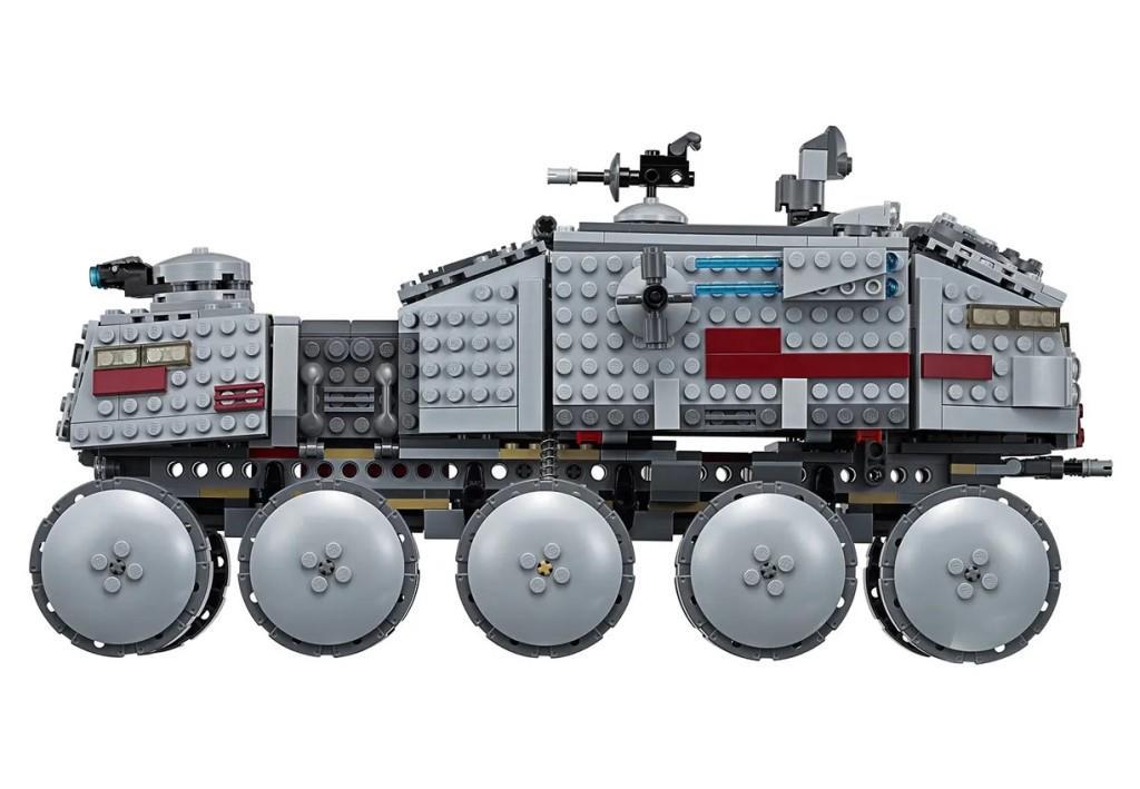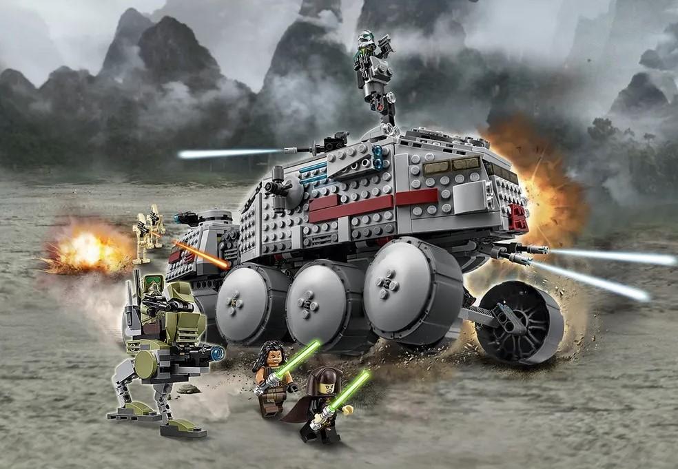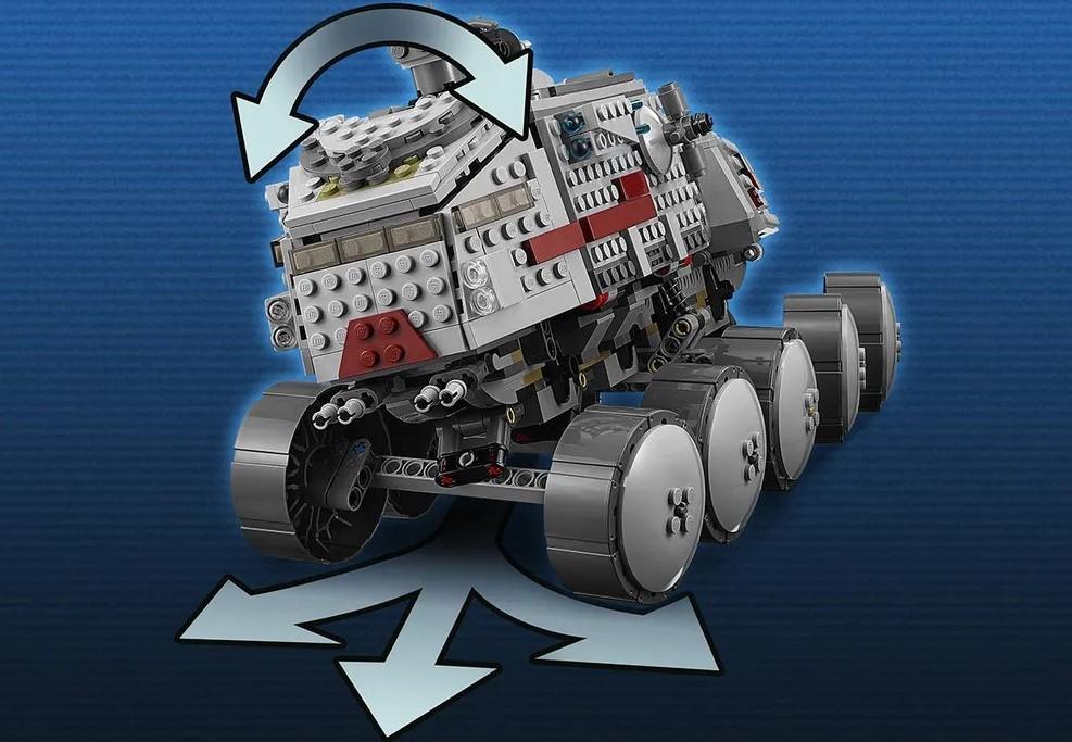 Планета Кашиик, известная также как Мир вуки, была воплощением гармонии и спокойствия. Огромные зелёные леса, состоящие из раскидистых деревьев, долгие годы укрывали своих обитателей от врагов. Во время Войн клонов правящим вуки удавалось достаточно долго выдерживать нейтралитет и не поддерживать ни одну из враждующих сторон. Но однажды Галактическая Империя ввела на Кашиик свои войска и поработила всё население. Многие коренные жители были вынуждены взяться за оружие и пополнить ряды республиканских войск, прибывших на планету для её защиты. Под командованием мастера Йоды, Луминары Ундули и Квинлана Воса совместная армия солдат-клонов и вуки попыталась дать достойный отпор захватчикам и вернуть мир на одну из самых живописных планет Галактики. Во время переброски военных сил и техники на Кашиик, республиканцы учитывали все особенности планеты. Боевые машины должны были обладать не только мощным вооружением, но и прекрасно маневрировать в условиях бездорожья и заболоченных территорий. Идеальным транспортником, сочетающим в себе эти качества, стал Турботанк, представленный в наборе. Его основа базируется на 5 парах колёс, оборудованных надёжными амортизаторами. Подобная конструкция позволяет преодолевать любые препятствия и не задумываться о внесении изменений в проложенный курс. Турботанк идёт напролом, стараясь вывести из строя максимальное количество боевых единиц противника. Конечно же, такой напор поддерживается многослойной бронёй, прикрывающей весь корпус. Управление танком достаточно сложное. Исходя из того, что машина прекрасно едет как вперёд, так и назад, то в её устройстве предусмотрены сразу две капитанские кабины. Обе они имеют распашную конструкцию, позволяющую заглянуть внутрь и рассмотреть интерьер. Первая кабина предназначена для одного водителя, отвечающего не только за движение, но и за работу вращающейся лазерной пушки, закреплённой на крыше. За кабиной устроен небольшой отсек с выдвижным контейнером, в котором можно перевозить боеприпасы.
