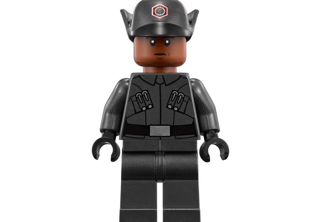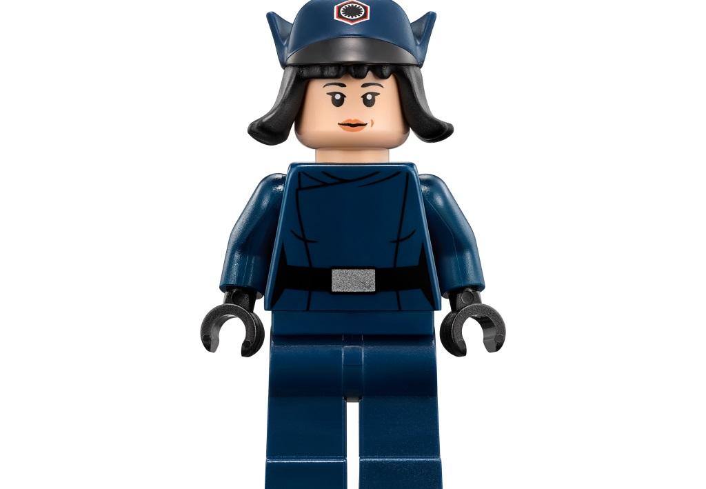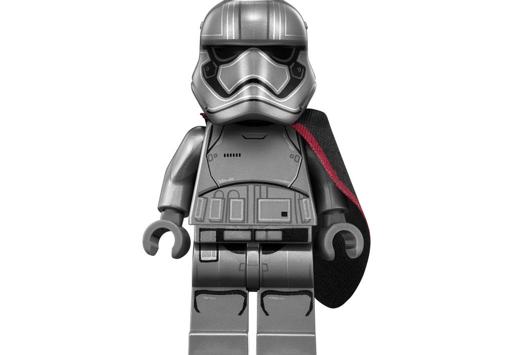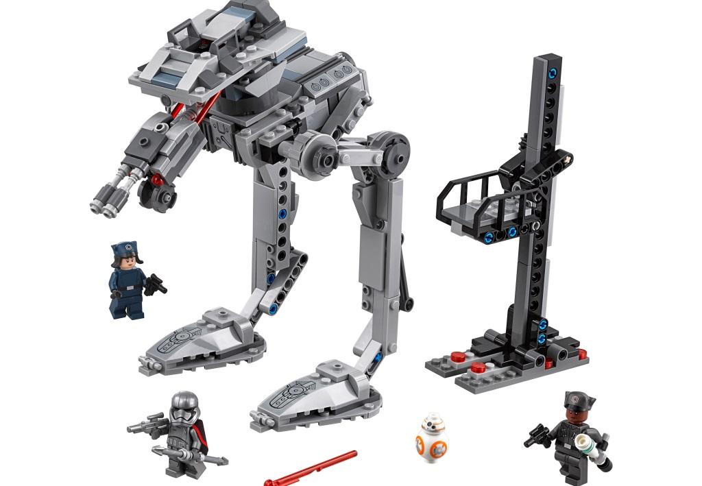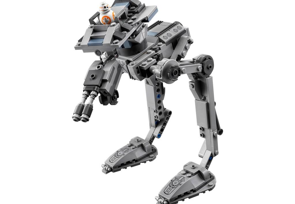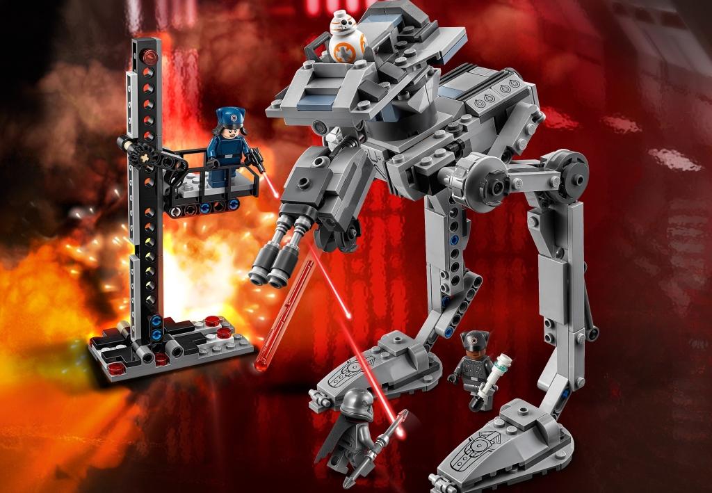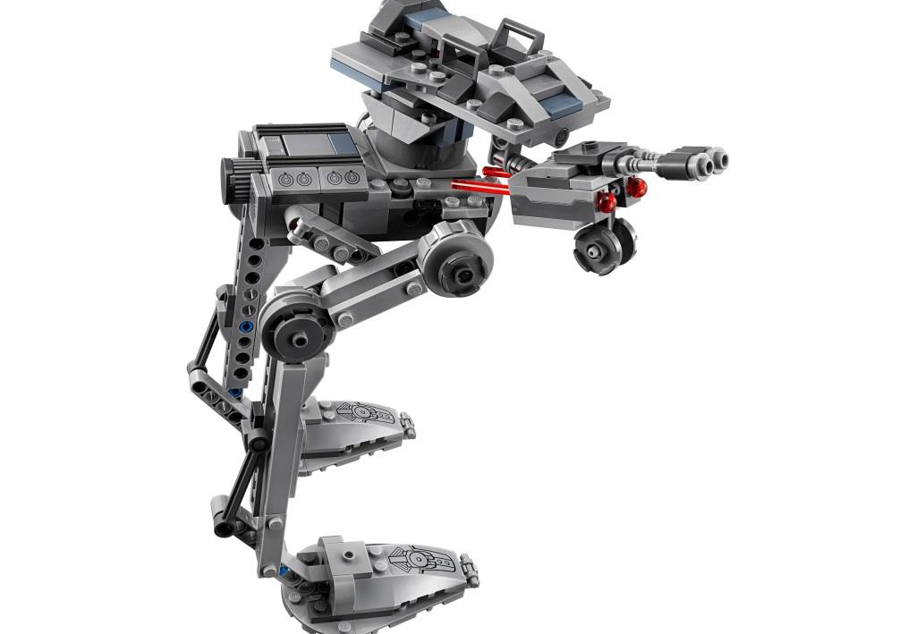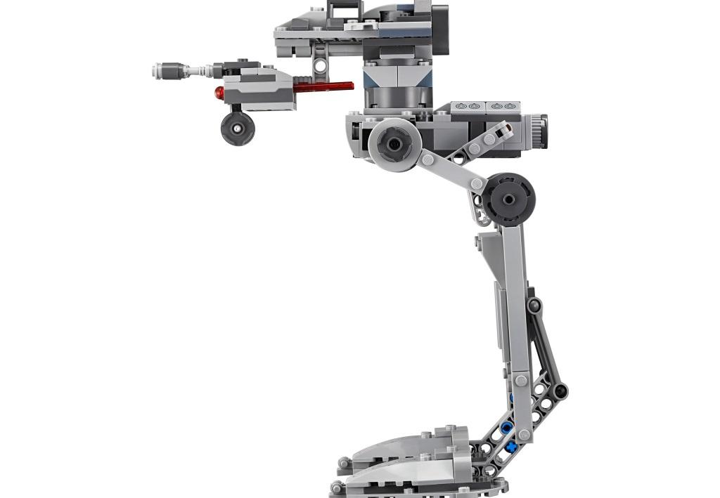 Финн и Роуз Тико проникли на борт звёздного разрушителя Первого ордена в надежде отключить систему гипертрекинга, следящего за перемещением кораблей Сопротивления. План героев не увенчался успехом, и они попали в плен штурмовиков, находящихся под командованием капитана Фазмы. Казнить лазутчиков было поручено штурмовикам-палачам, вооружённым лазерными топорами. Но в тот момент, когда приговор должны были привести в исполнение, на звездолёт была совершена атака. Часть корпуса сильно пострадала и начала разрушаться. Воспользовавшись воцарившейся паникой, дроид-астромеханик BB-8 захватил один из боевых шагоходов и открыл огонь по Фазме и её штурмовикам. Опытному капитану удалось увернуться от выстрелов и направиться в сторону Финна. Активировав силовую пику, Фазма набросилась на ненавистного изменника, который к тому времени уже успел вооружиться энергодубинкой. Финн с трудом противостоял закалённой в боях воительнице, но на помощь ему пришла Роуз. Перемещаясь на подъёмнике, она стала вести стрельбу по Фазме, отвлекая её от дуэли. Из деталей набора Вы сможете собрать шагоход Первого ордена. Его корпус покрывает многослойная серая броня. Сверху располагается открытая кабина с защитными бортиками. В ней предусмотрена ниша для одной минифигурки, занимающей место перед панелью управления. Благодаря подвижному основанию, кабина способна вращаться и вести прицельный огонь по противнику. В этом ей помогает сдвоенная бластерная пушка и мощный шутер, способный пробить крепкую броню. Обновлённая конструкция опор выглядит очень надёжно. Боковые сочленения и удлинённые стопы позволяют уверенно стоять на поверхности. Во время сражения шагоход способен активно перемещаться, не теряя равновесие. Это говорит об отличной маневренности и надёжности боевой машины. Размер AT-ST составляет 22х20х13 см. Также в наборе Вы найдёте подъёмник (17х4х8 см) с поднимающейся и опускающейся платформой и 4 минифигурки с оружием: капитан Фазма с силовой пикой, Финн с энергодубинкой, Роуз