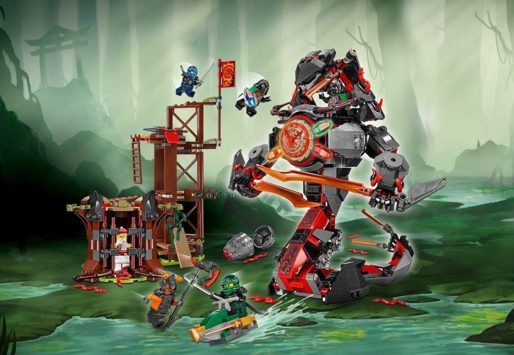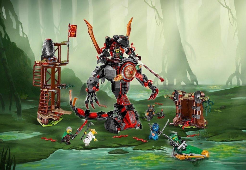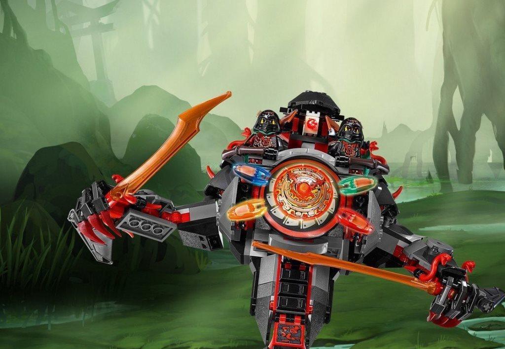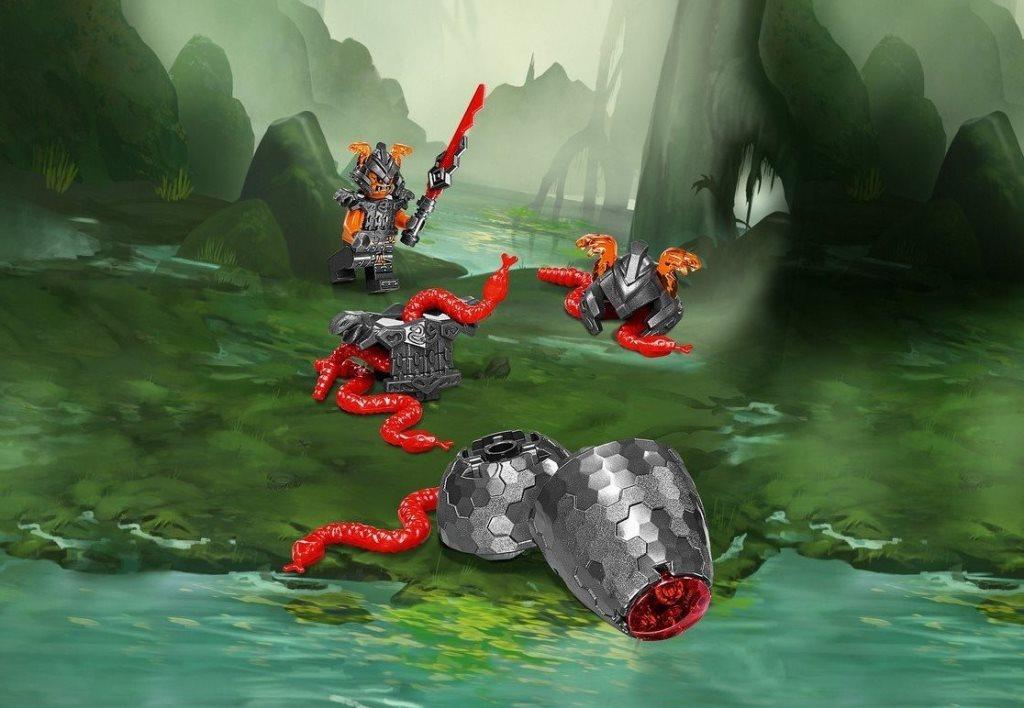 Стремясь получить власть над временем, близнецы Крукс и Акроникс смогли отыскать все магические Клинки. Закрепив их на специальной панели, злодеи решили активировать Портал Времени, дарующий своим создателям неограниченную силу. Чтобы помешать близнецам воплотить в жизнь их коварный план, в форт Алой армии отправился Мастер Ву. Но в одиночку справиться с врагами он не сумел. Его взяли в плен и посадили в надёжную тюремную камеру, находящуюся под охраной ядовитых змей. Теперь помочь ему смогут только Джей и Ллойд, спешащие через джунгли и болота к тайному форту похитителей волшебных Клинков. Из деталей набора Вы сможете собрать подробную модель форта Алой армии. Условно всю конструкцию можно разделить на две части. Слева располагается тюремный блок, окружённый прочными деревянными стенками и цепкими лианами. Его фронтальная часть представляет собой массивную решётку, захлопывающуюся на два ядовитых клыка. Подступы к тюремной камере охраняют красные змеи, прячущиеся среди камней и травы. Правая часть форта сделана в виде высокой дозорной башни. Она состоит из нескольких уровней, на каждый из которых ведёт откидная лестница. На вершине красуется красно-жёлтый флаг, а рядом с ним виднеется площадка часового. Если он почует опасность, то немедленно скинет вниз чешуйчатое яйцо, наполненное ядовитыми змеями. Поэтому ниндзя, спешащие на помощь Мастеру Ву, должны соблюдать осторожность и не задерживаться надолго под дозорной площадкой. Размер форта в собранном виде составляет 19х20х11 см. Следует отметить, что конструкция форта имеет модульное строением. Благодаря наличию дополнительных креплений и лестниц, внешний вид постройки можно менять, создавая различные игровые пространства. Также в наборе Вы найдёте множество элементов для создания Механического змея (высотой 23 см). Он очень силён и опасен! Его гибкий и подвижный торс способен принимать множество боевых стоек и активно участвовать в сражении. Каждый, кто встанет на пути змея, должен остерегаться!