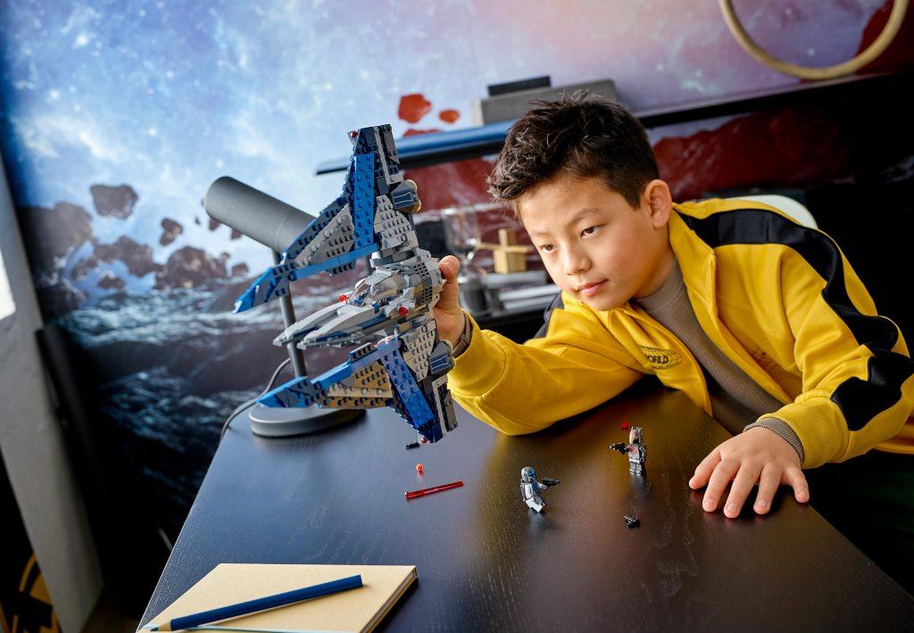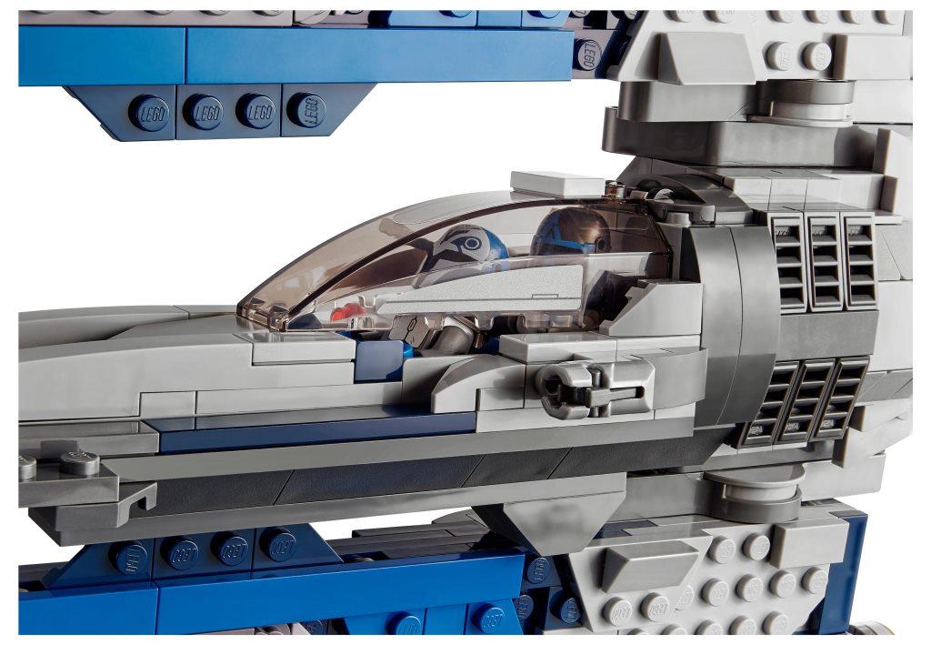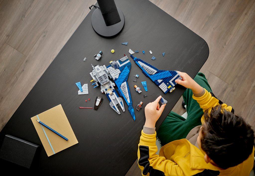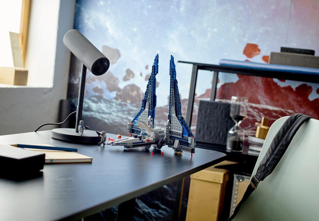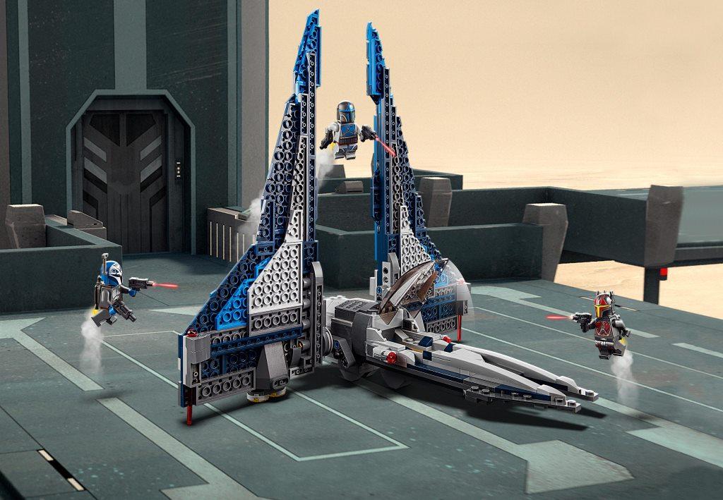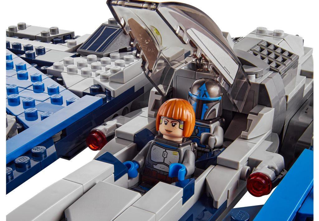 Эффектный набор купить можно как детей, так и для взрослых. Собранная модель звездолета сможет стать не только прекрасным украшением комнаты, но и благодаря своей возможности менять положения крыльев и кабины, а также наличию стреляющих пружинных шутеров, принесет массу положительных эмоций и ярких впечатлений от динамичной игры. Конструктор поближе познакомит фанатов одноименного фильма, а также ценителей космического транспорта, с моделью необычного истребителя. Набор состоит из 544 элементов, из которых собирается не только летательный аппарат, но и три эксклюзивные минифигурки, а именно: Бо-Катан Крайз, Гара Саксона и мандалорского лоялиста. Все минифигурки детально проработаны и имеют шлемы, оружие, а также реактивные рюкзаки. Размеры корабля в собранном виде составляют 33 см в длину, 30 см в ширину и 6 см в высоту. Звездолет представлен в новой цветовой гамме, сочетая в себе серый, синий, голубой и белый оттенок, что придают кораблю особый стиль эффектность. Кабина корабля открывается и позволяет разместить внутри две минифигурки, не снимая с них реактивных рюкзаков. Благодаря специальному шаровому механизму центральная часть звездолета может поворачиваться на 3600, а массивные крылья менять свое положение из горизонтального в вертикальное. По бокам космический корабль оборудован пружинными ракетными установками.